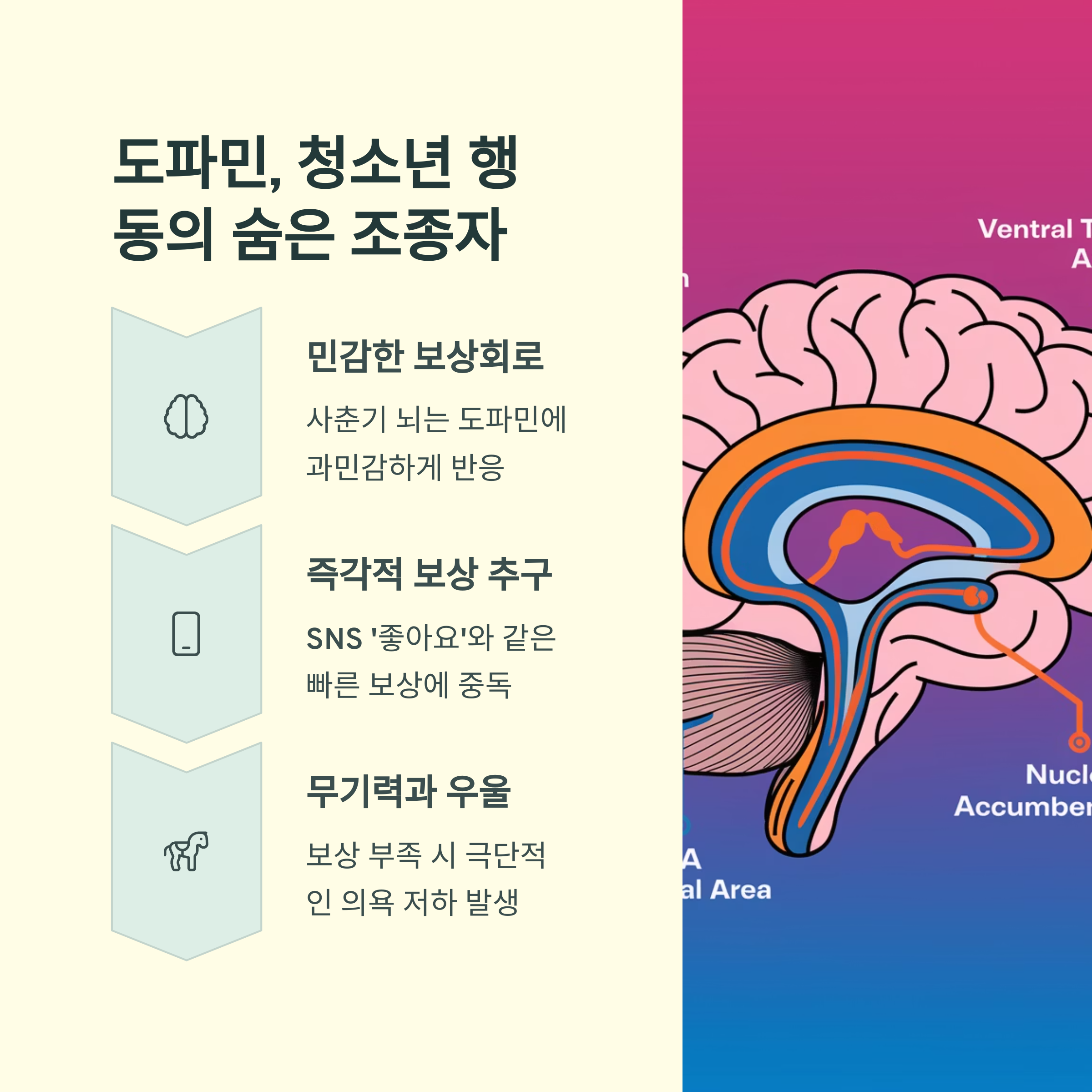 - 사춘기 뇌는 쾌감을 느끼는 도파민 수용체가 폭발적으로 증가