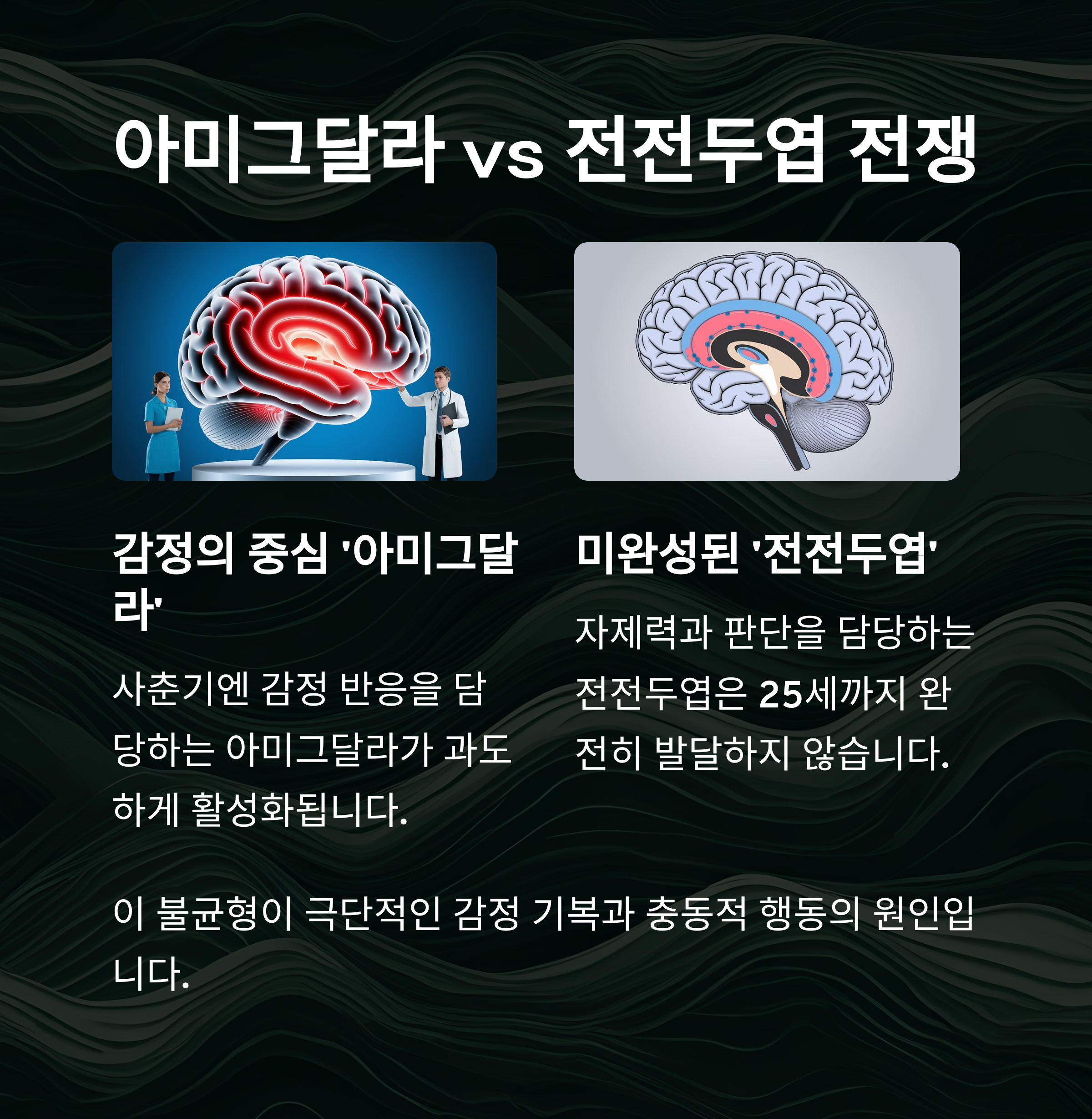 사춘기 뇌는 두 개의 부위 사이에서 균형을 잃고 흔들립니다. 감정은 폭주하지만, 그 감정을 조절하고 조망할 능력은 아직 약하죠. 이를 뇌 구조로 풀어보면 아래와 같습니다.