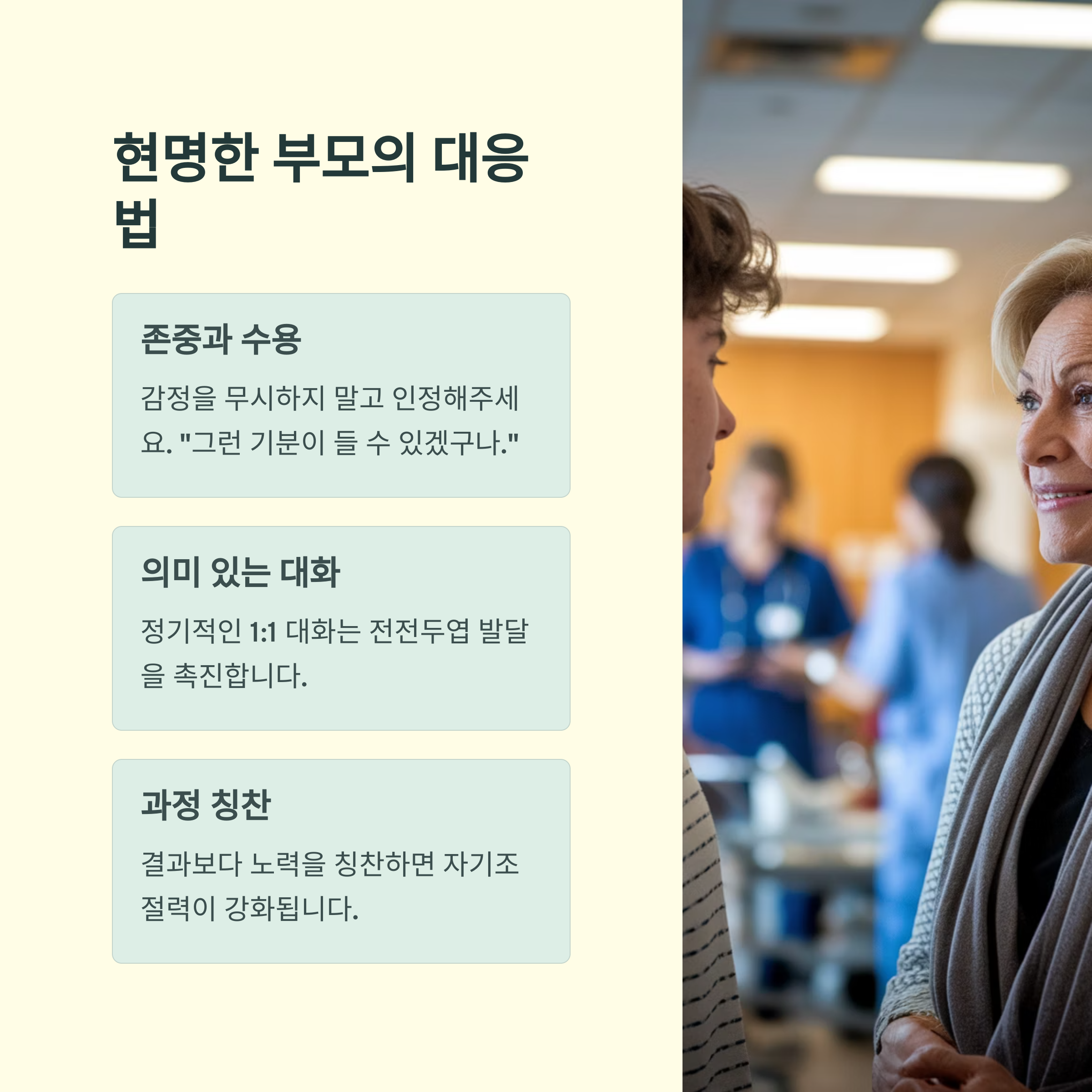 사춘기 뇌의 변화는 감정과 행동을 극단적으로 만들 수 있지만, 그렇다고 무조건 ‘내버려 두라’는 이야기는 아닙니다. 올바른 반응 전략은 분명히 존재합니다.