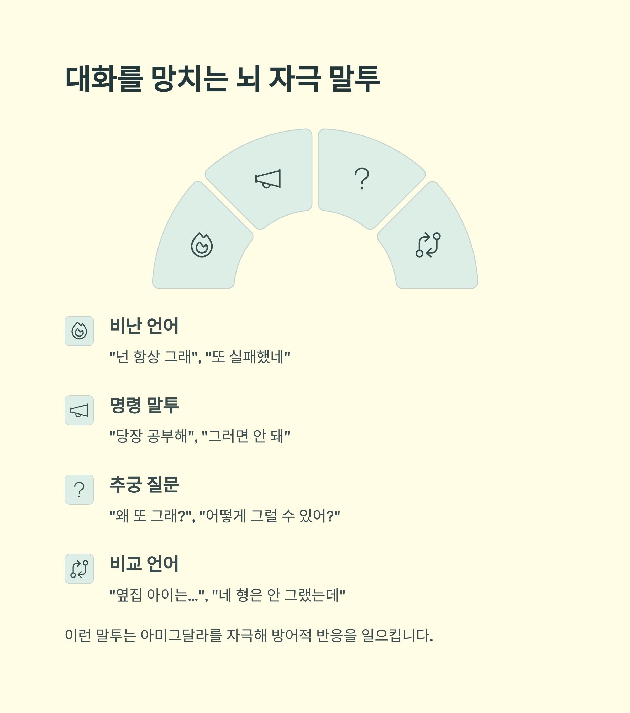 아이의 아미그달라를 자극하는 말투는 순식간에 대화를 ‘전쟁’으로 바꿔버립니다. 다음은 대표적인 피해야 할 표현과 대안입니다.
