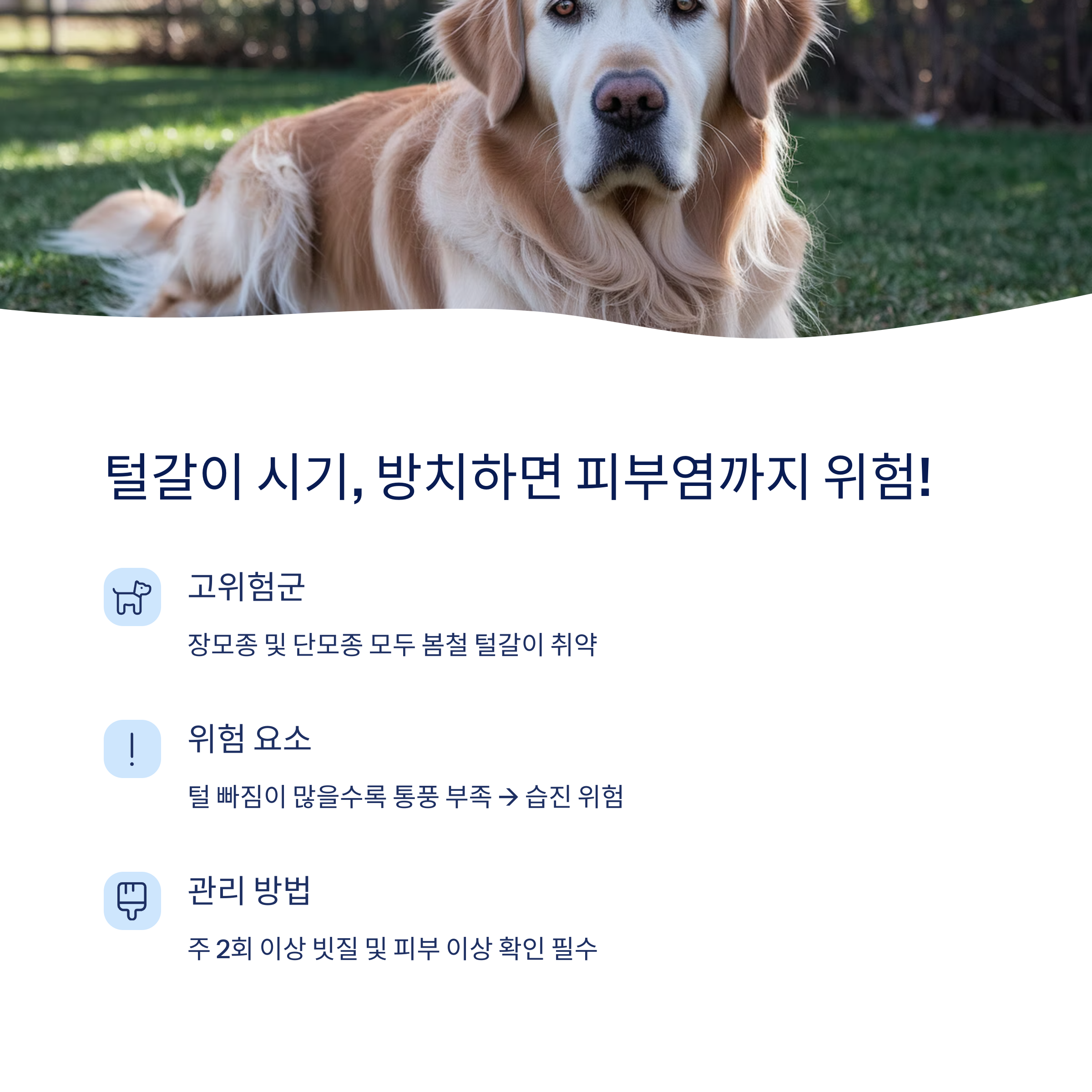 이 시기에 죽은 털을 정리하지 않으면 피지 분비가 증가하고, 피부 통풍이 어려워지며 습진 및 곰팡이 감염 위험이 높아집니다.