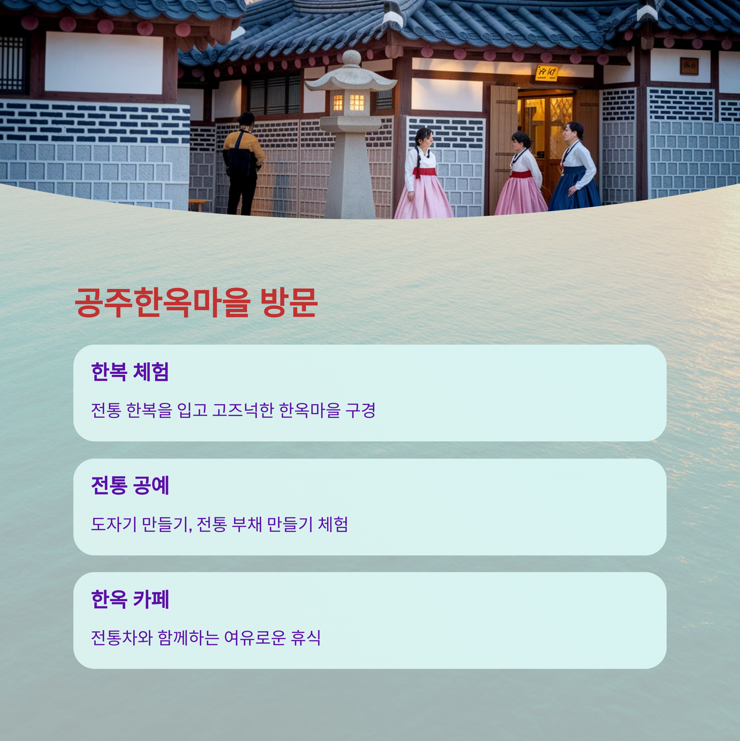 | 전통 문화 체험, 한옥 감성 숙소 | 백제 유물 관람, 가족 여행 추천 | 사찰과 벚꽃이 어우러진 힐링 장소 |