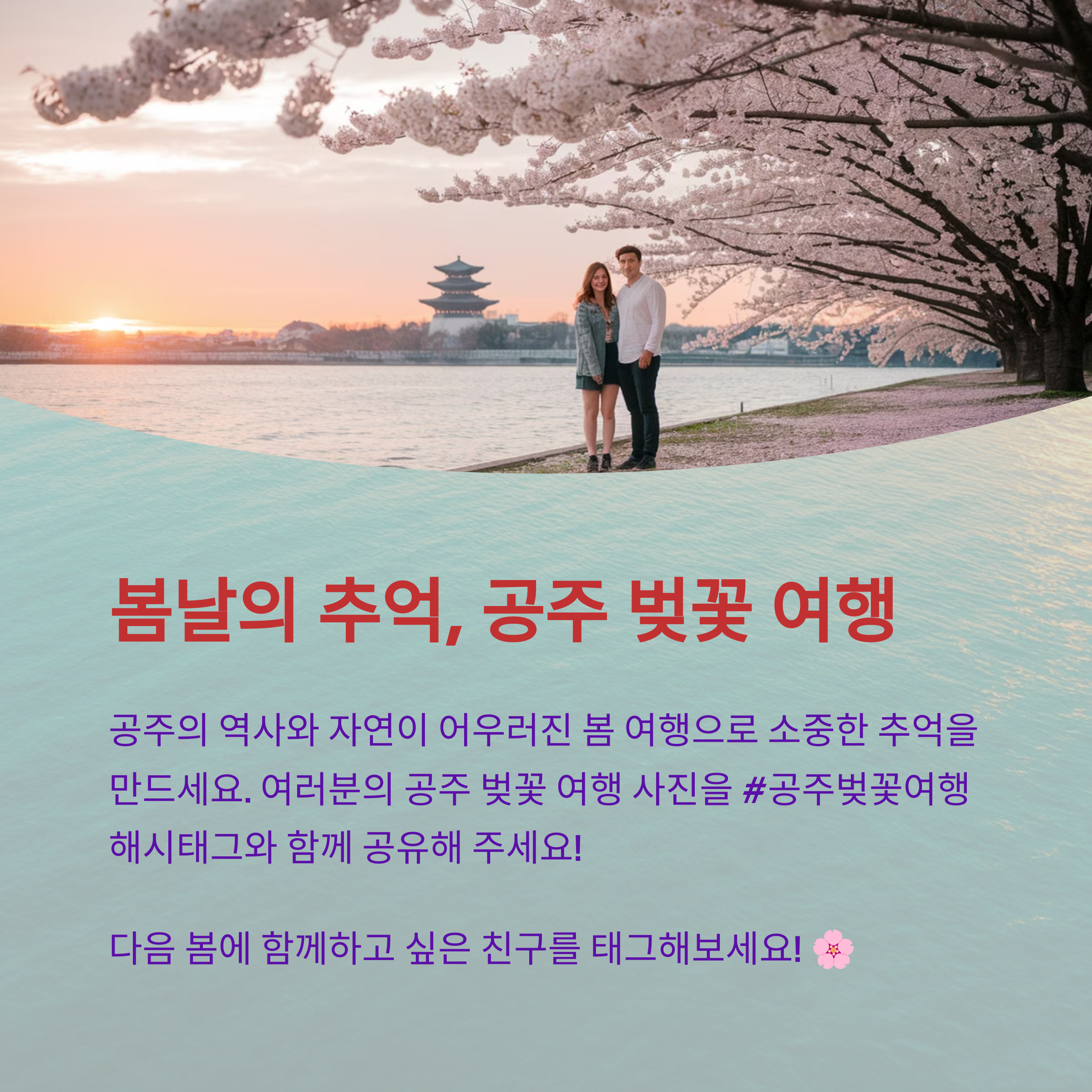 공주는 그 자체로 문화와 자연이 공존하는 도시입니다. 벚꽃 시즌에는 특히 한적한 분위기 속에서 여유롭게 자연을 즐길 수 있어 인파에 지친 분들에게도 좋은 선택이 됩니다. 여행 일정이 짧더라도 공주의 매력을 충분히 경험할 수 있으며, 계절을 즐기고, 역사와 소통하고, 마음의 쉼을 얻는 여행으로 기억에 남을 것입니다.