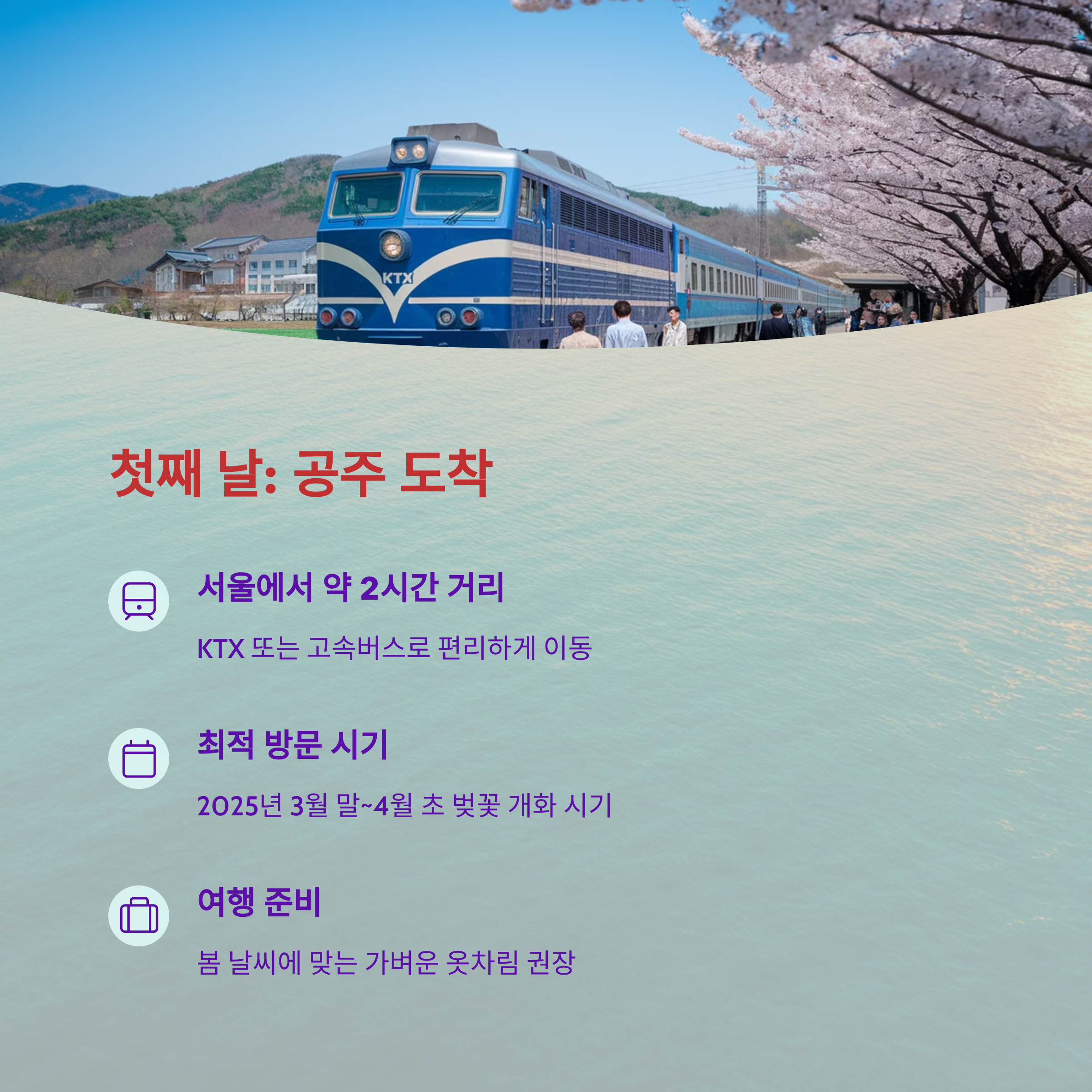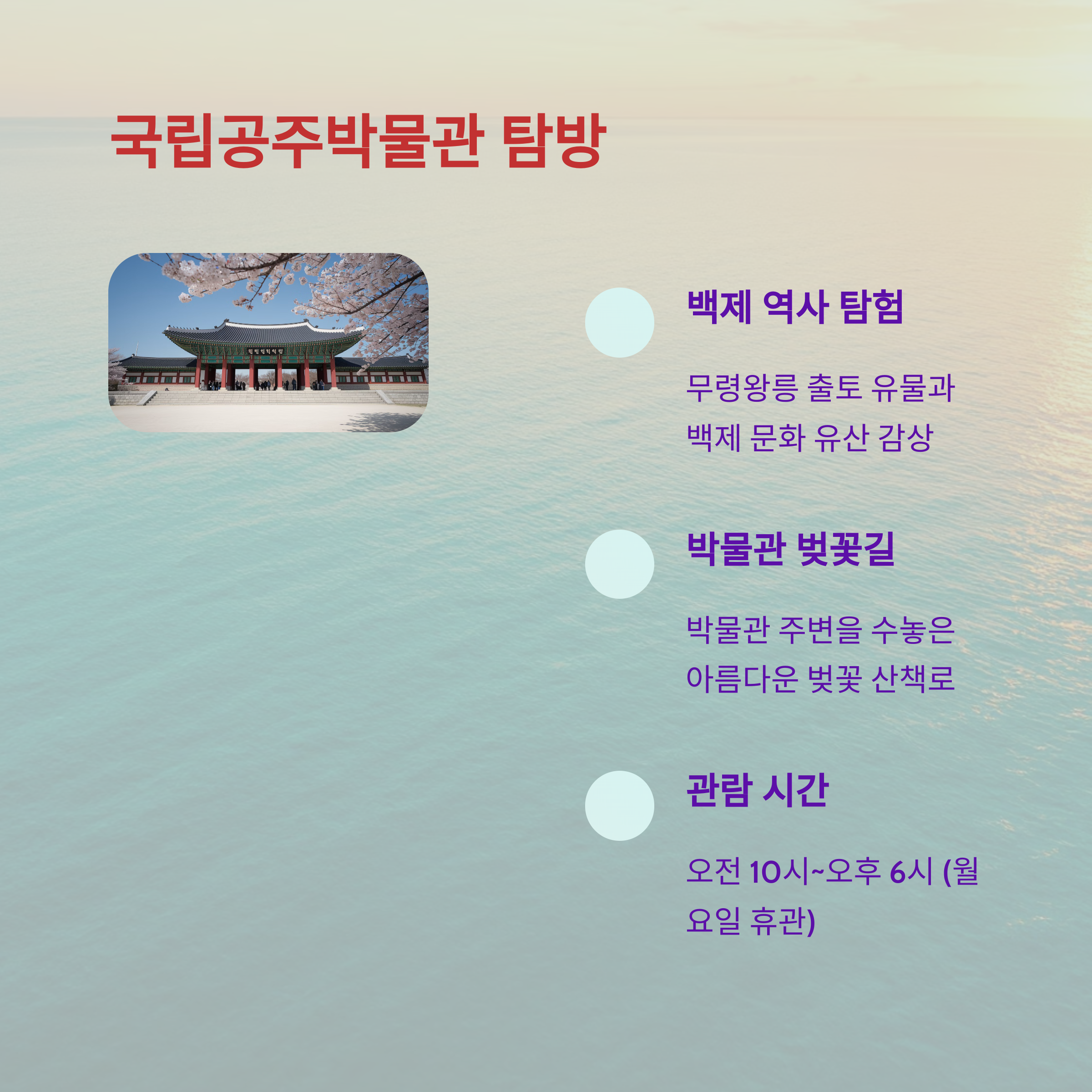 | 공주 여행 초보자에게도 적합 | 공주의 역사, 아이들과 체험 가능 | 봄 한정 시즌 추천 루트 |