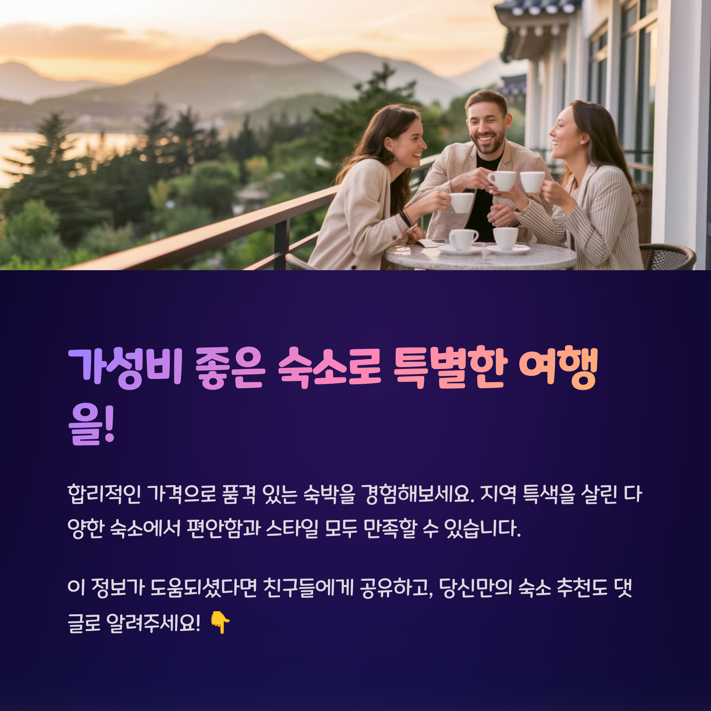 여러분이 다녀오신 가성비 좋은 숙소가 있다면 댓글로 공유해주세요! 지역, 가격, 분위기 등 생생한 후기를 나눠주시면 다른 분들께 큰 도움이 됩니다.