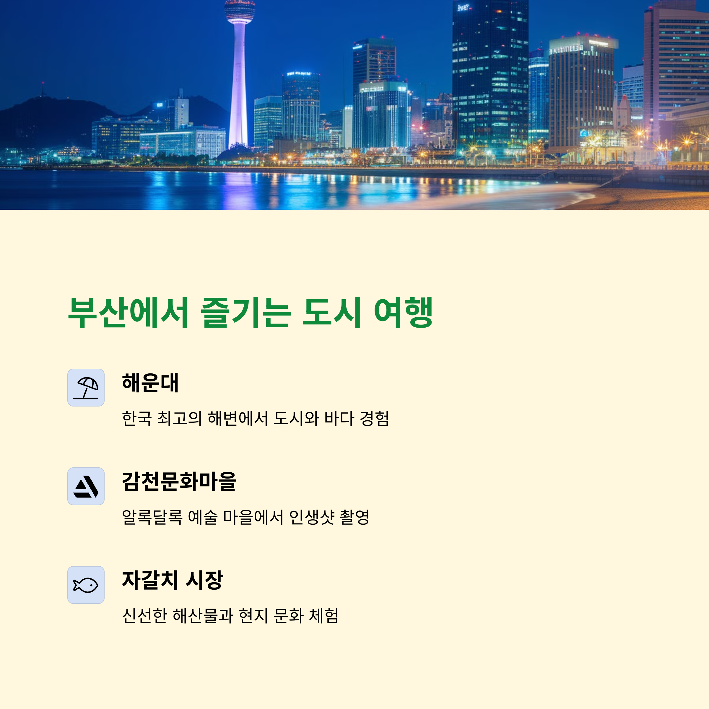지역별 코스를 고를 때는 계절, 동선, 관심사에 따라 다르게 접근해야 합니다. 제주는 자연과 휴양 중심으로 서핑과 해변 산책 코스가 인기를 끌고 있으며, 부산은 해운대, 감천문화마을, 부산타워 같은 도심 속 감성 여행지로 알차게 구성할 수 있습니다. 서울은 고궁, 인사동, 홍대 등 전통과 예술이 공존하는 공간을 중심으로 문화 체험과 카페 투어까지 조합이 가능합니다. 전남의 여수는 해상케이블카, 아쿠아플라넷 등으로 아트투어와 바다 전망을 즐길 수 있어, 가족, 연인 모두에게 만족도가 높은 루트로 추천됩니다.