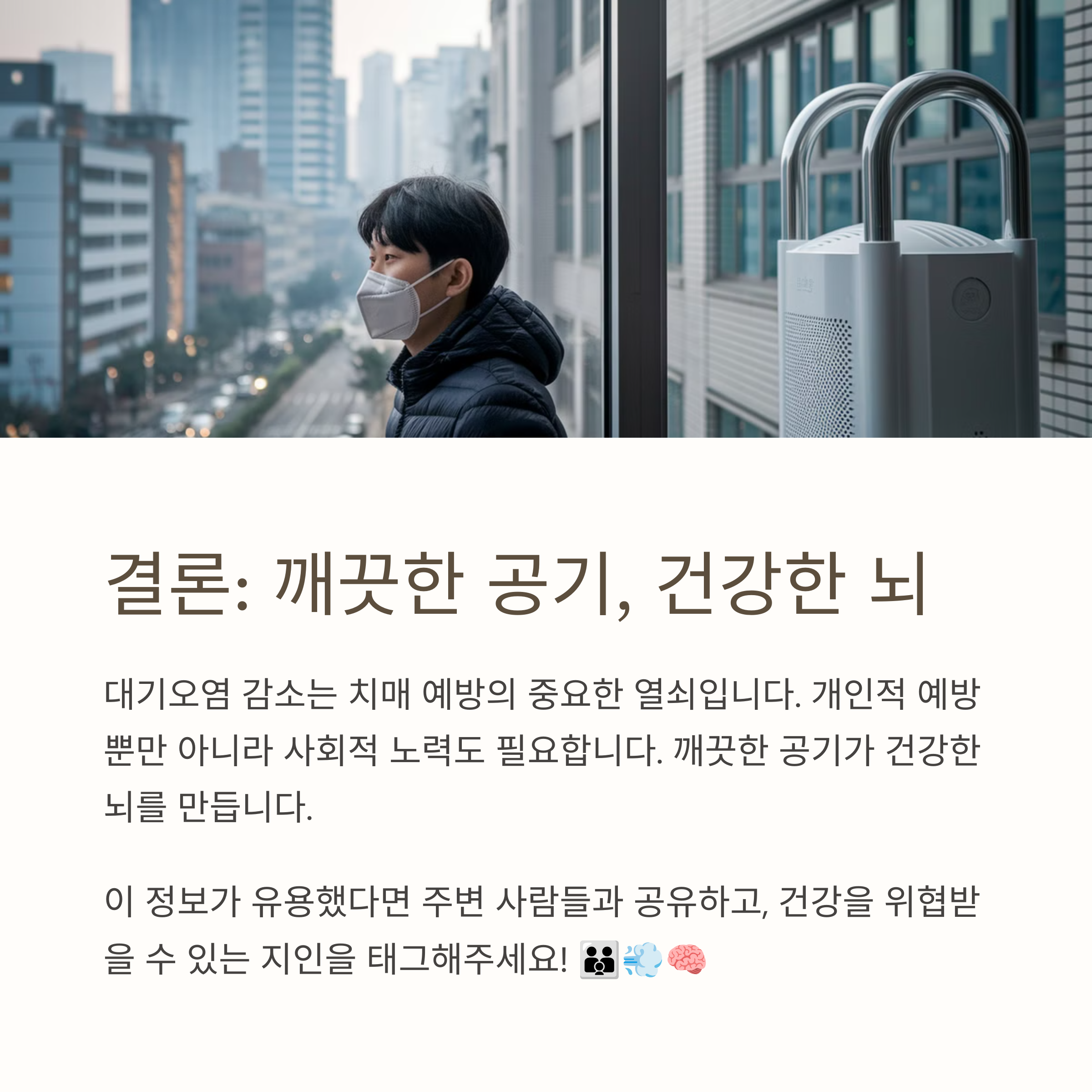 치매를 예방하기 위해서는 대기질 개선이 반드시 필요합니다. 실외 활동 시 미세먼지 수치를 확인하고, 고농도 시에는 외출을 자제하거나 KF94 이상의 마스크를 착용하는 것이 좋습니다. 공기청정기나 환기 시스템의 적절한 사용 또한 실내 공기질 유지에 도움을 줍니다. 정부와 개인이 함께 노력하여 환경을 개선하고 건강을 지켜야만 미래 세대의 두뇌 건강도 보호할 수 있습니다.