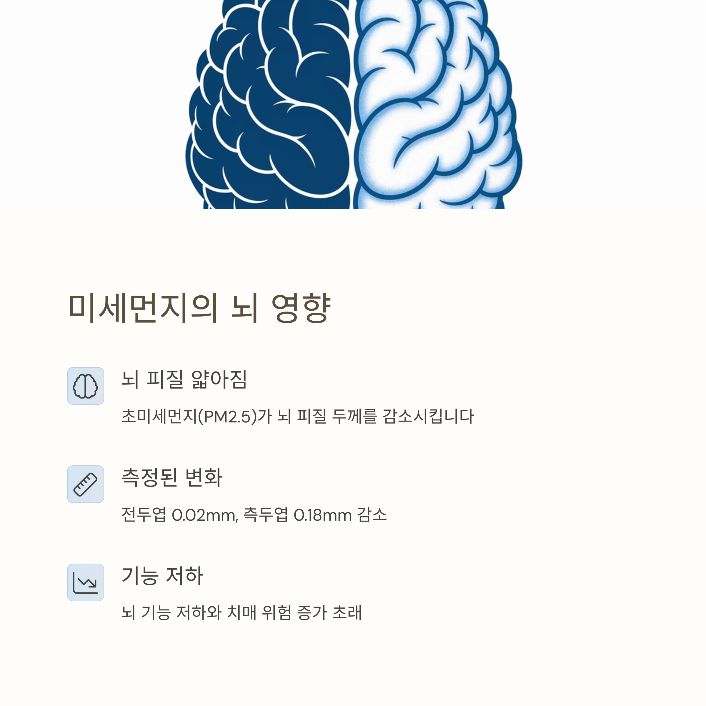 | PM2.5는 뇌까지 침투해 신경세포를 손상시킬 수 있습니다. | 폐에서 유발된 염증은 뇌로 전파되어 손상을 줍니다. | 대기오염 노출을 줄이면 인지기능 유지에 도움이 됩니다. |