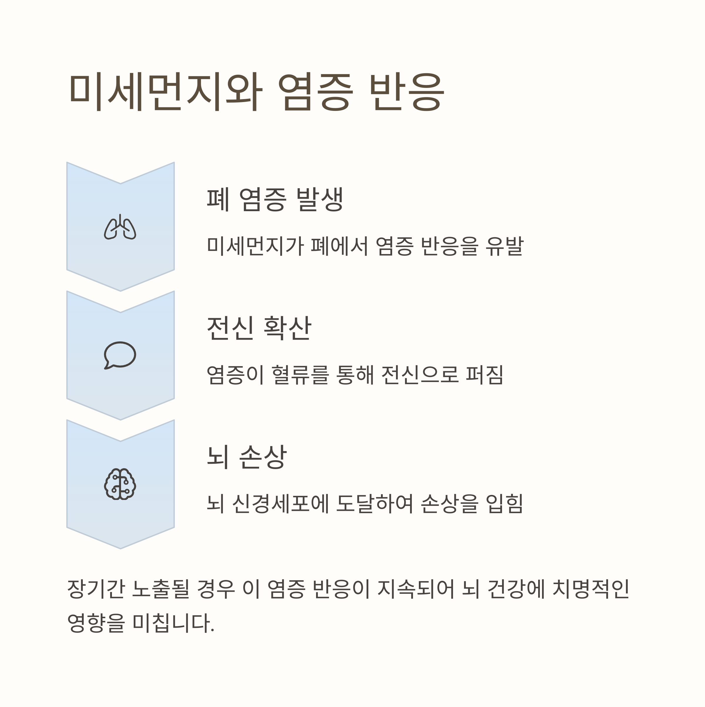 | 특히 어린이와 노인에게 더 큰 피해를 줄 수 있습니다. | 면역 반응이 과도해지면 혈뇌장벽까지 영향을 줍니다. | 마스크 착용, 공기청정기 활용 등이 효과적인 예방법입니다. |