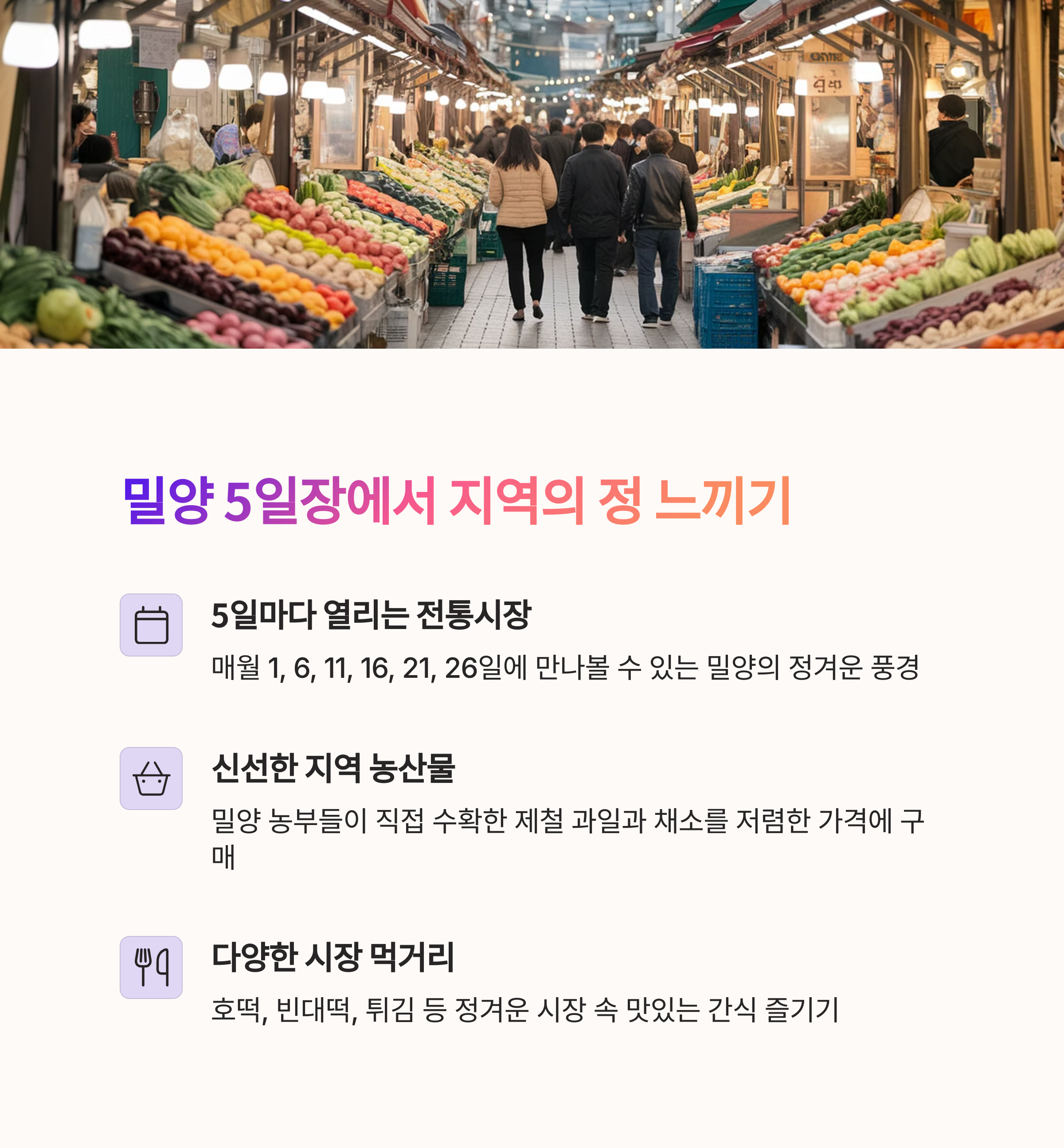 밀양 5일장은 전통 시장의 정겨움이 살아있는 곳이에요.