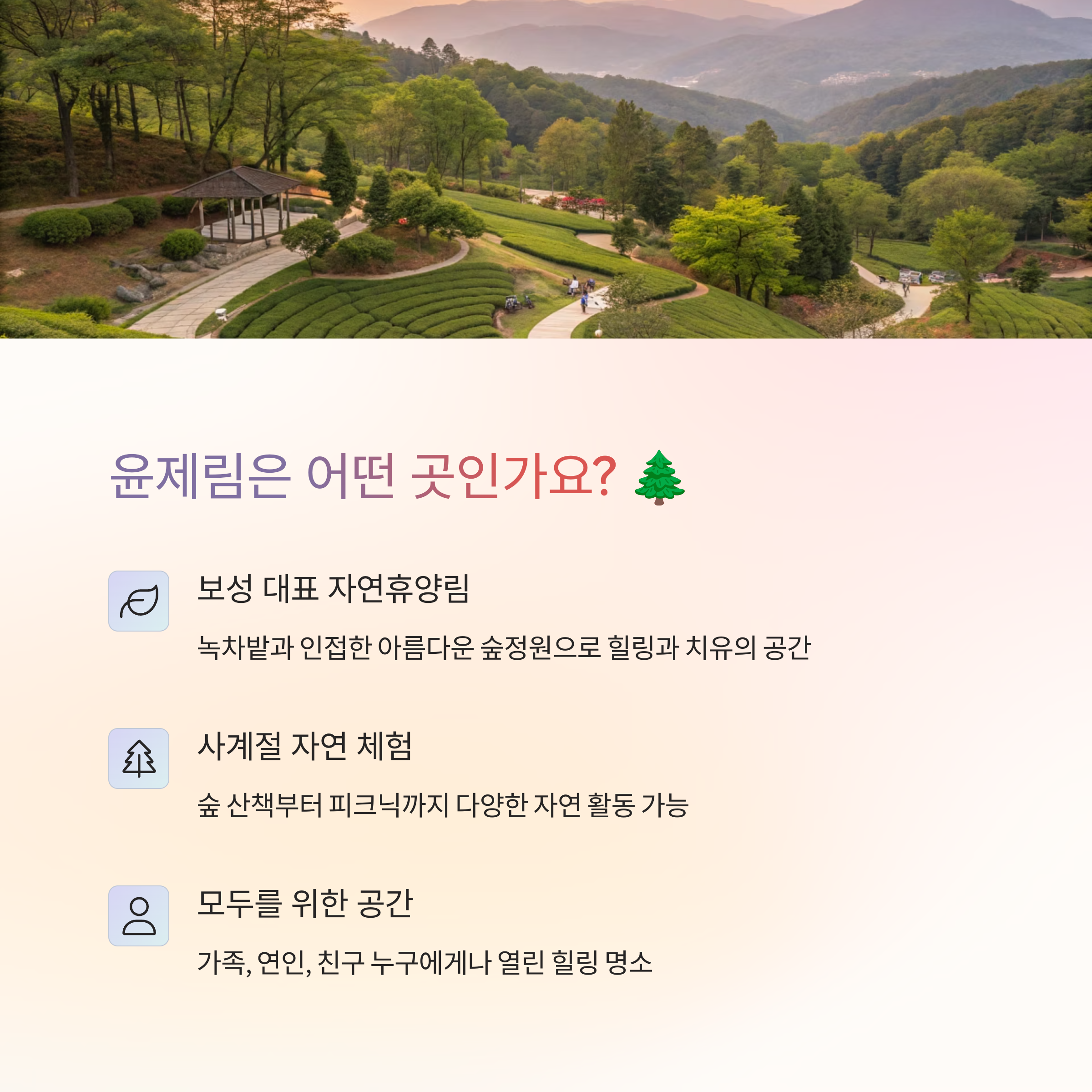 보성 윤제림은 단순한 관광지를 넘어서 삶의 쉼표, 마음의 힐링을 선물하는 공간입니다.