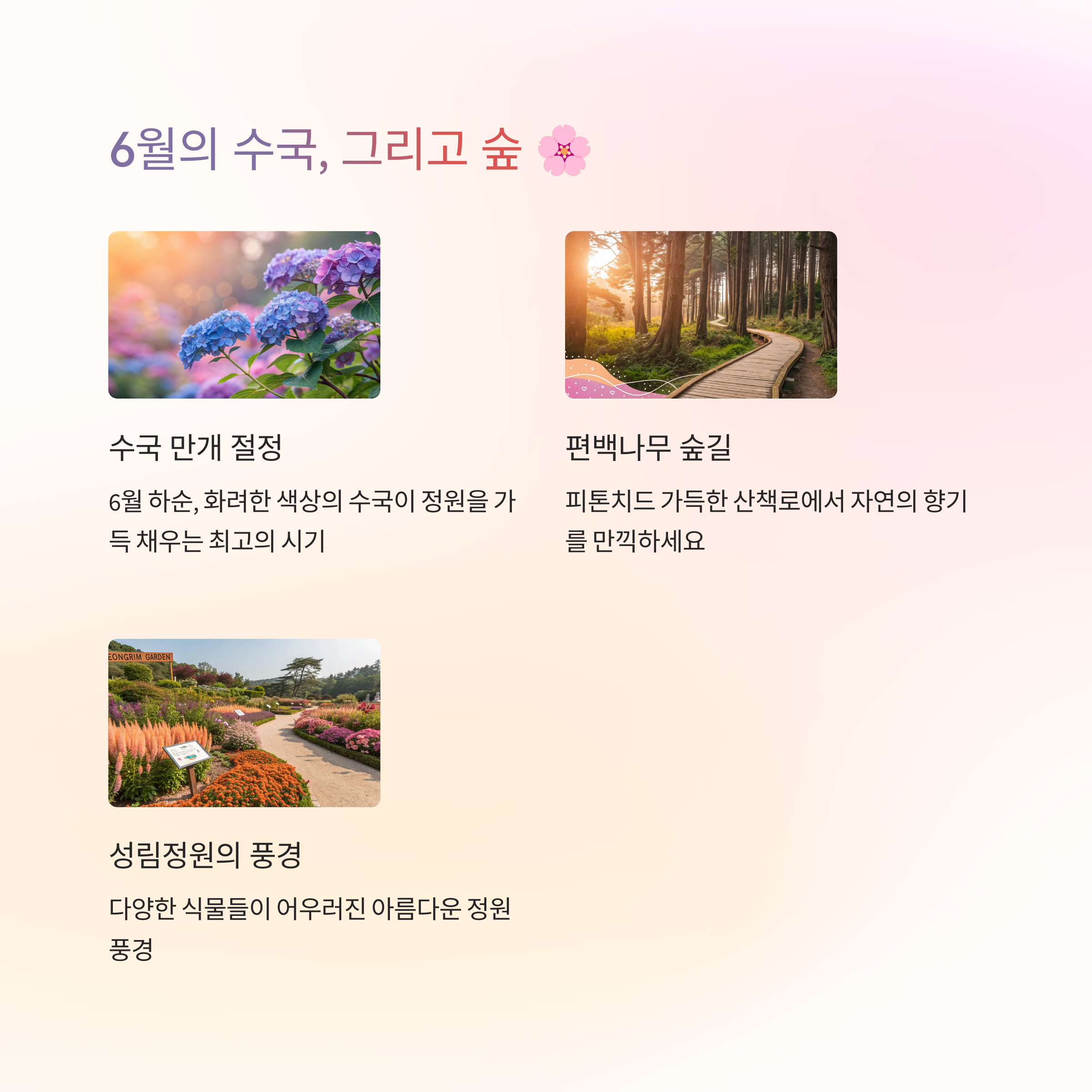 6월 중순부터 말까지가 가장 화려한 수국 시즌이에요! 늦지 않게 계획하시면 좋아요.