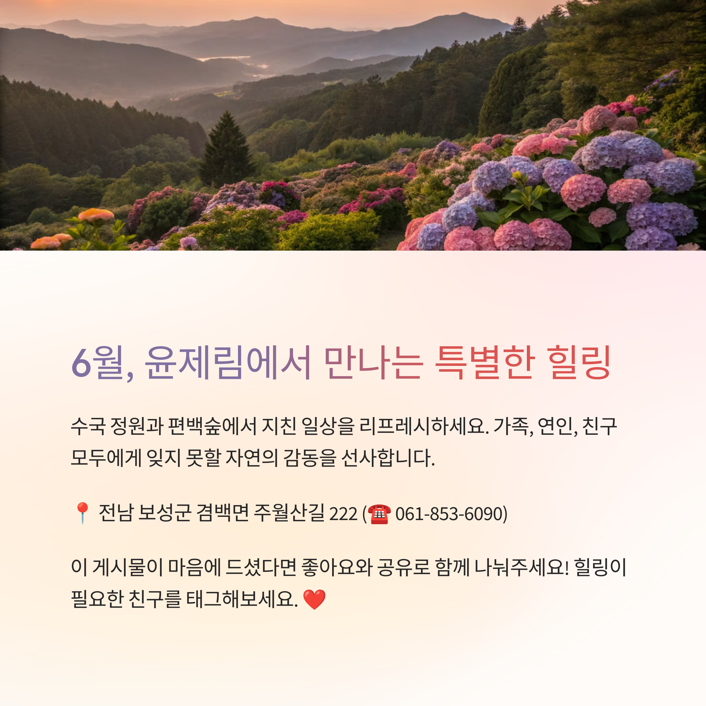 이번 6월 나들이를 계획하고 계신다면, 윤제림에서 피톤치드와 수국 향기 가득한 하루를 보내보시는 건 어떠세요?