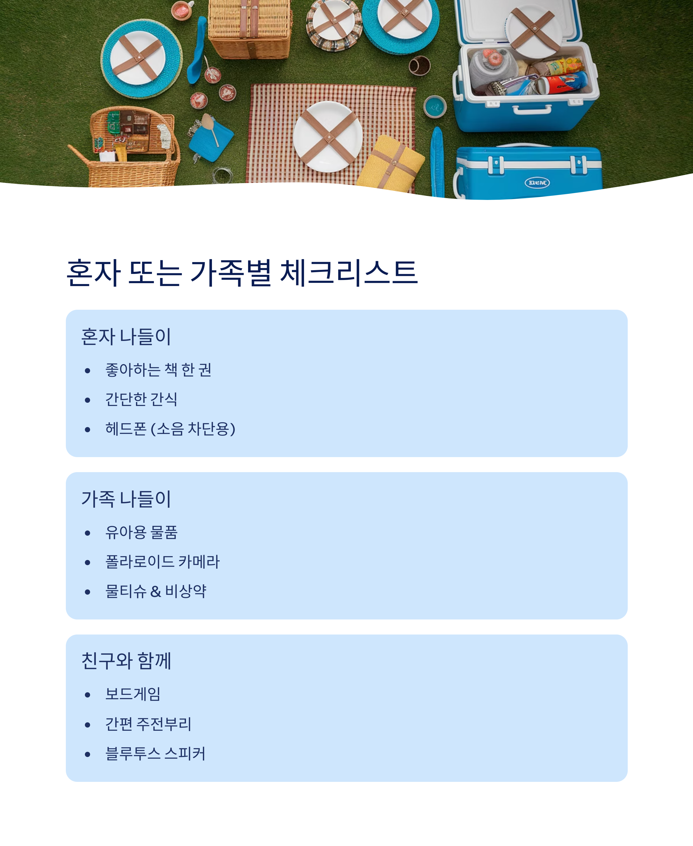 👨👩👧👦 가족과 함께라면? 아이 간식, 여벌 옷, 놀이 도구 필수. 공원이나 체험형 장소 위주로!