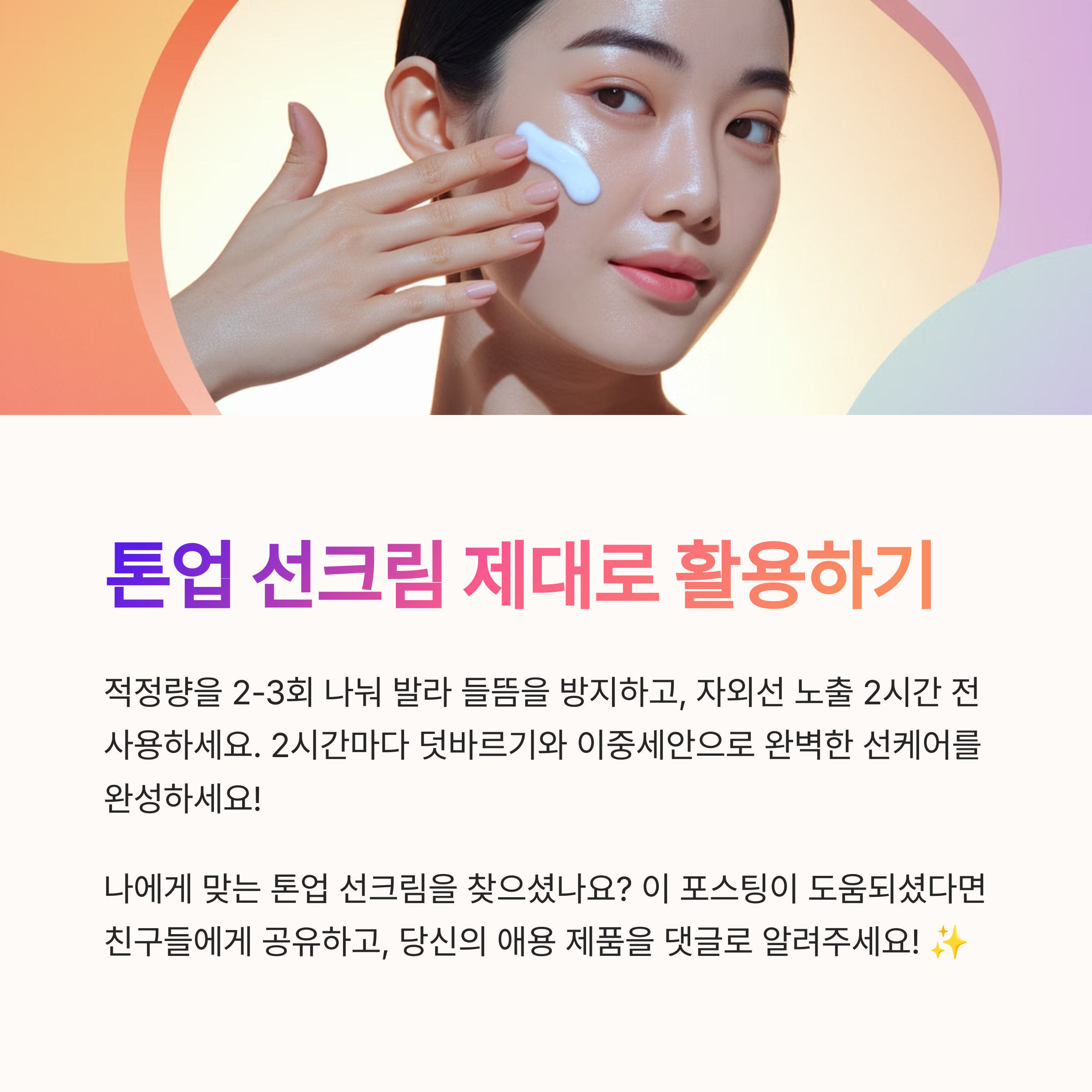여러분이 실제로 사용해본 톤업 선크림 중 가장 만족스러웠던 제품은 무엇인가요? 또는 피부 타입별 꿀조합이 있다면 댓글로 알려주세요. 함께 나누면 더 가치 있는 뷰티 팁이 됩니다!