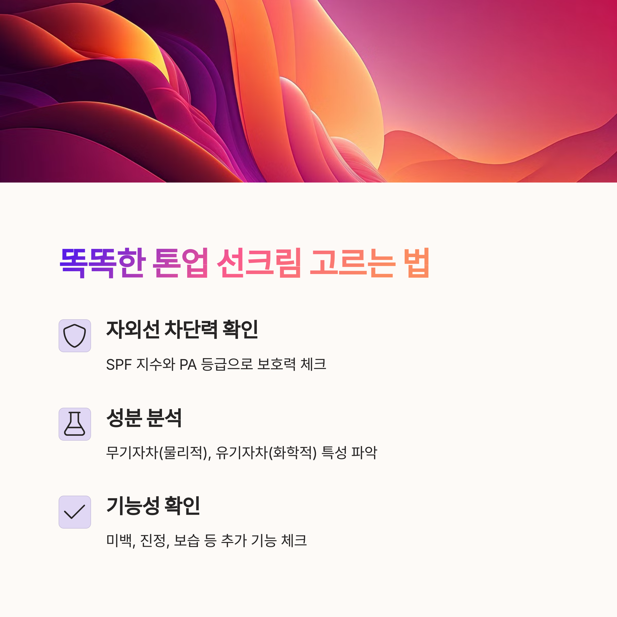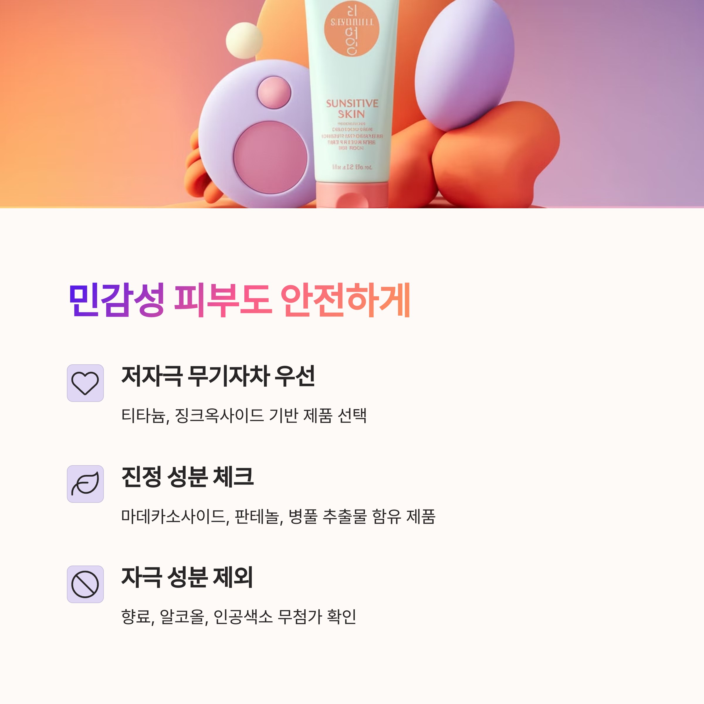 | 톤업 선크림 핵심 조건 | 백탁 없음, 자극 성분 무첨가, 가벼운 밀착력, 지속력 |
