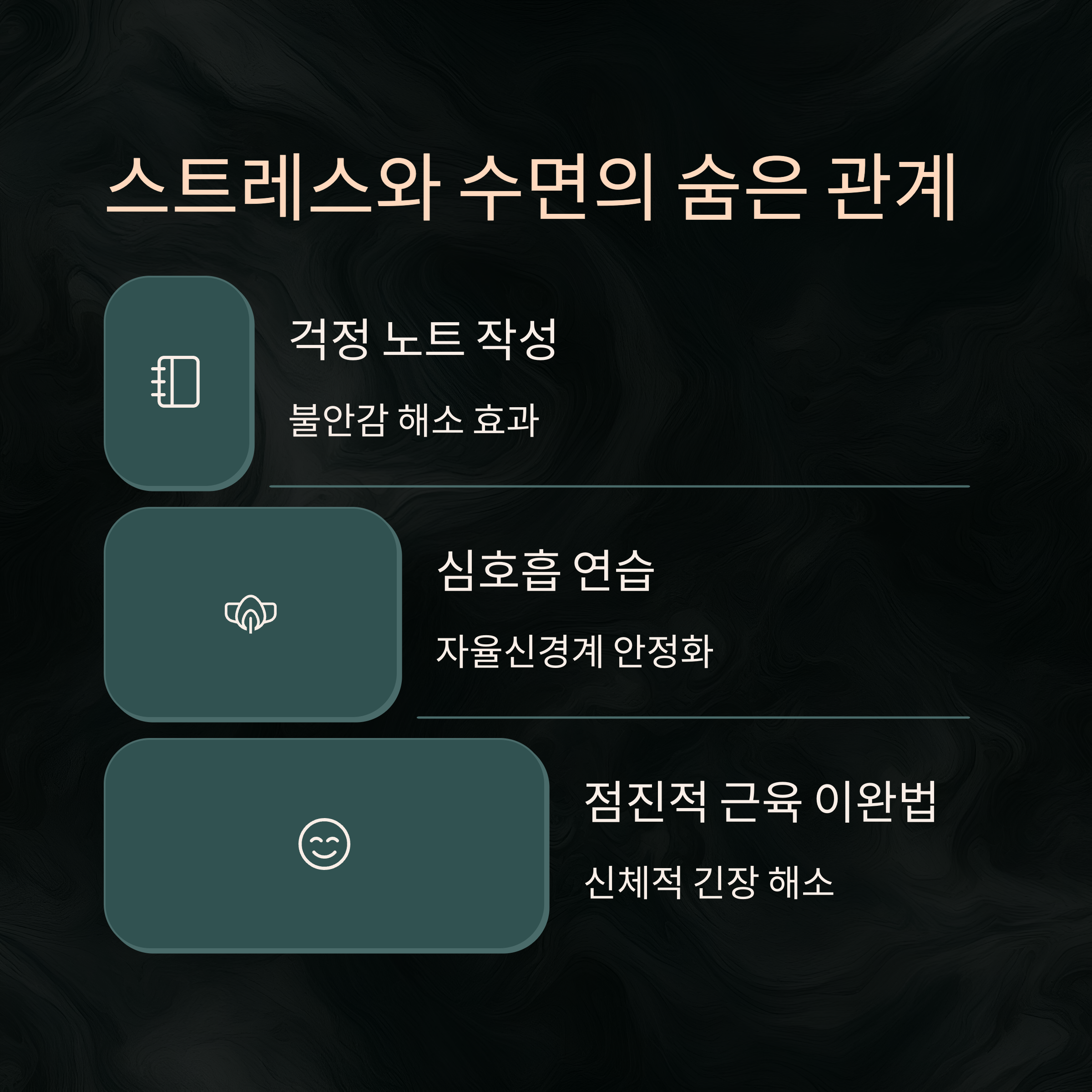 일정한 수면 시간 유지로 생체 리듬 안정화 | 온도, 조명, 소음, 침구류까지 섬세하게 조절 | 취침 전 전자기기 사용 줄이고 이완 시간 확보 |