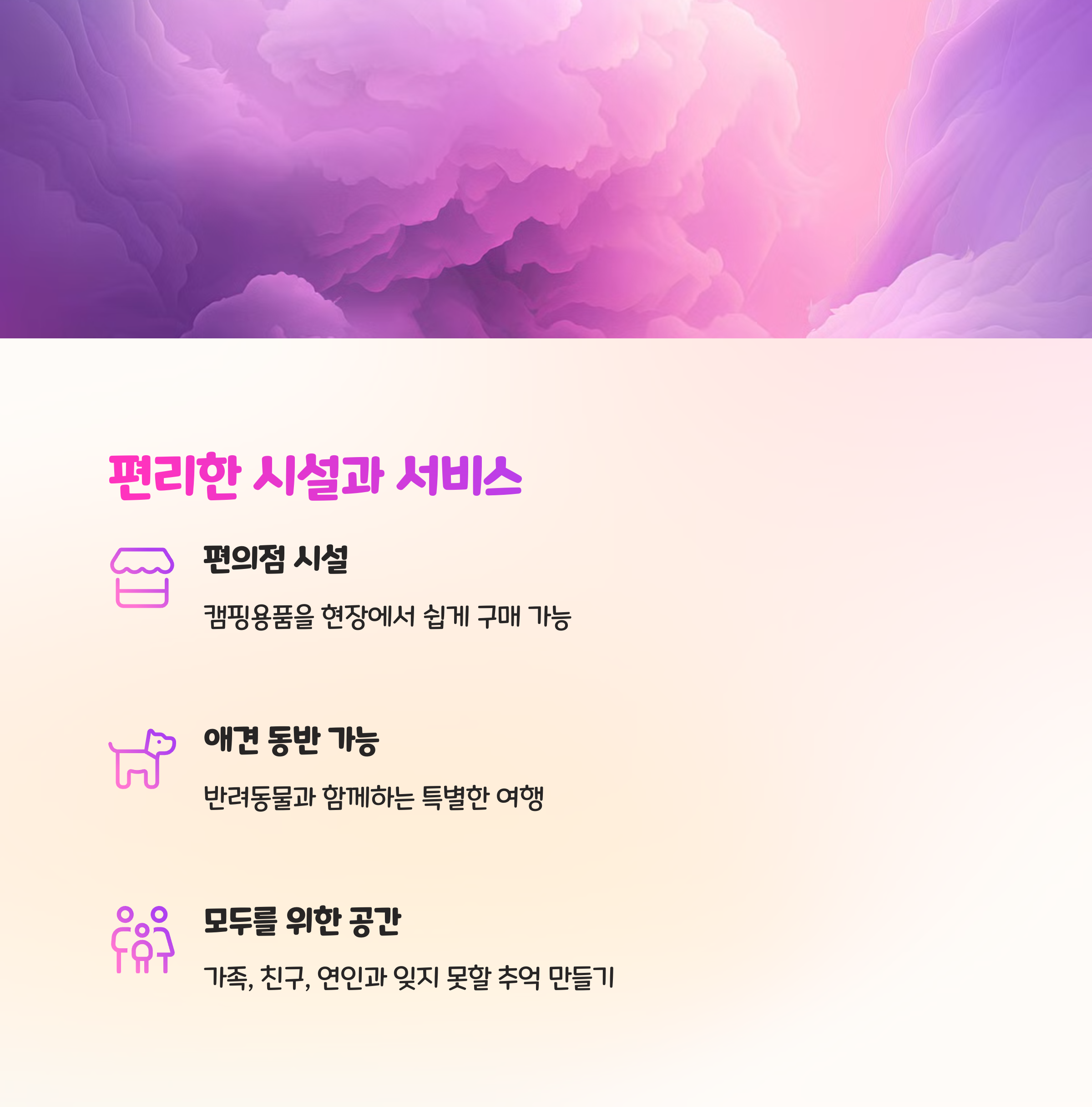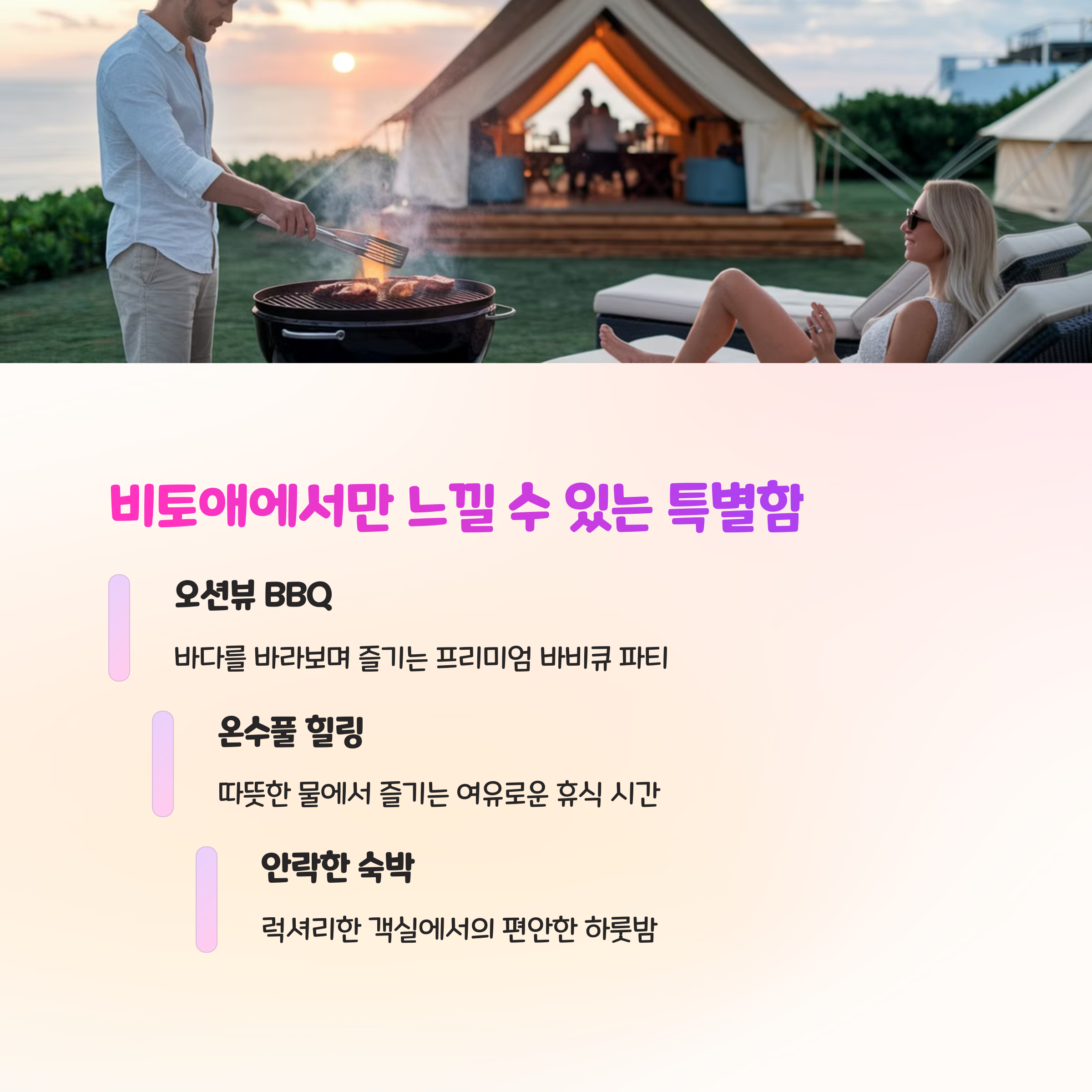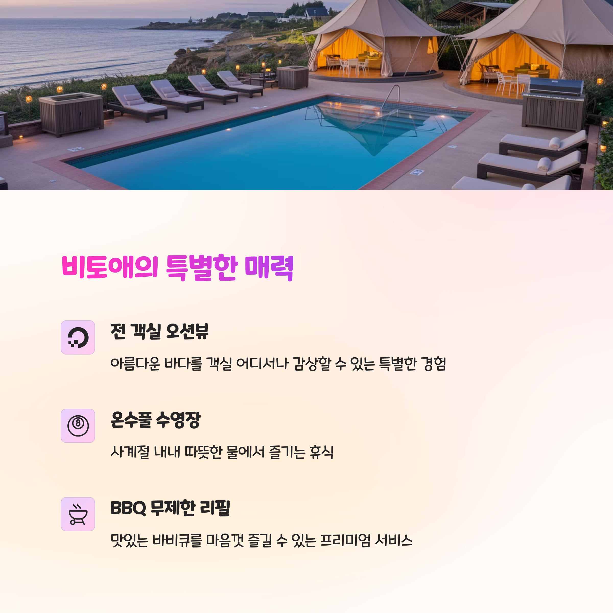 | 글램핑 특징 | 오션뷰, 온수풀, BBQ 리필, 반려견 동반 가능 |