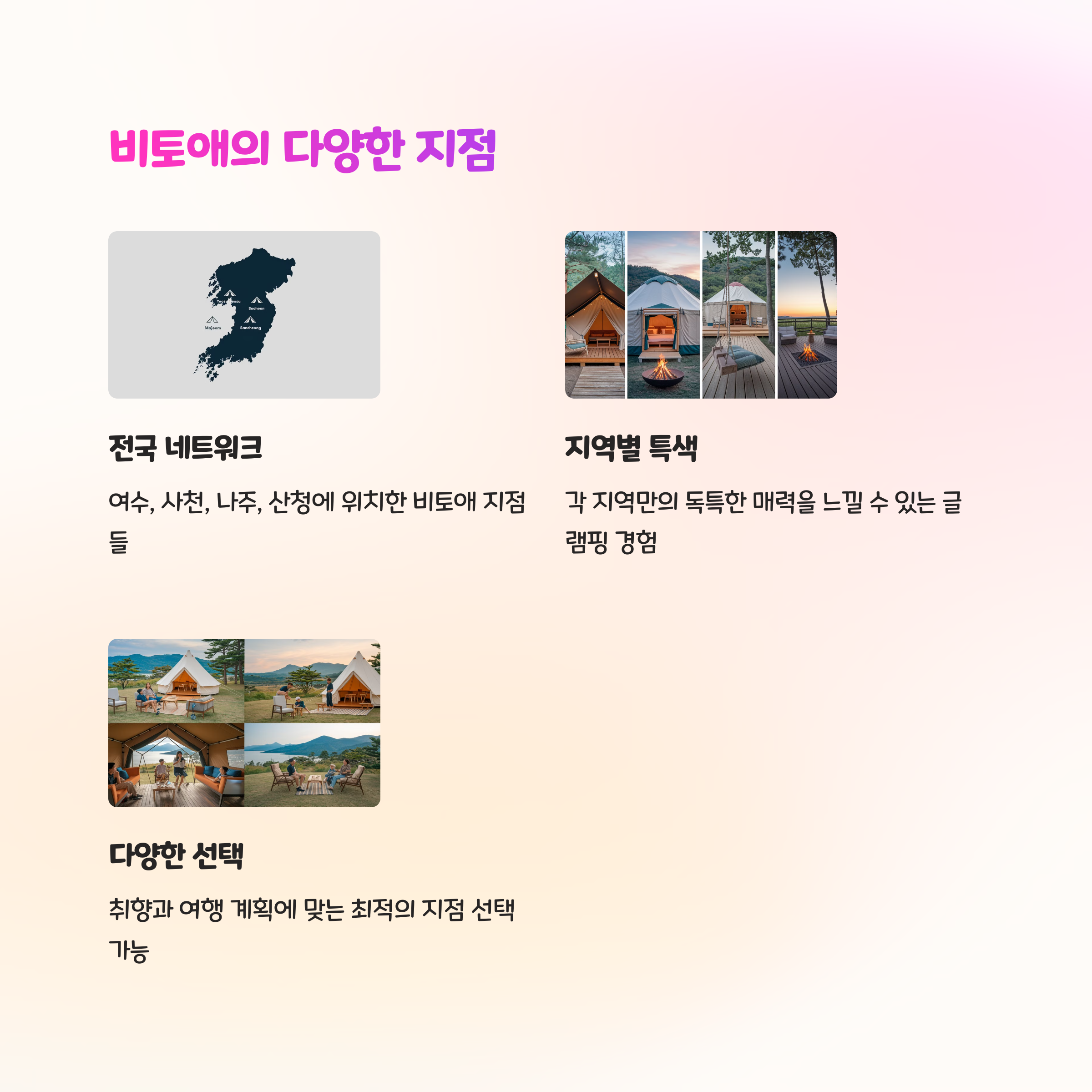 | 글램핑 특징 | 오션뷰, 온수풀, BBQ 리필, 반려견 동반 가능 |