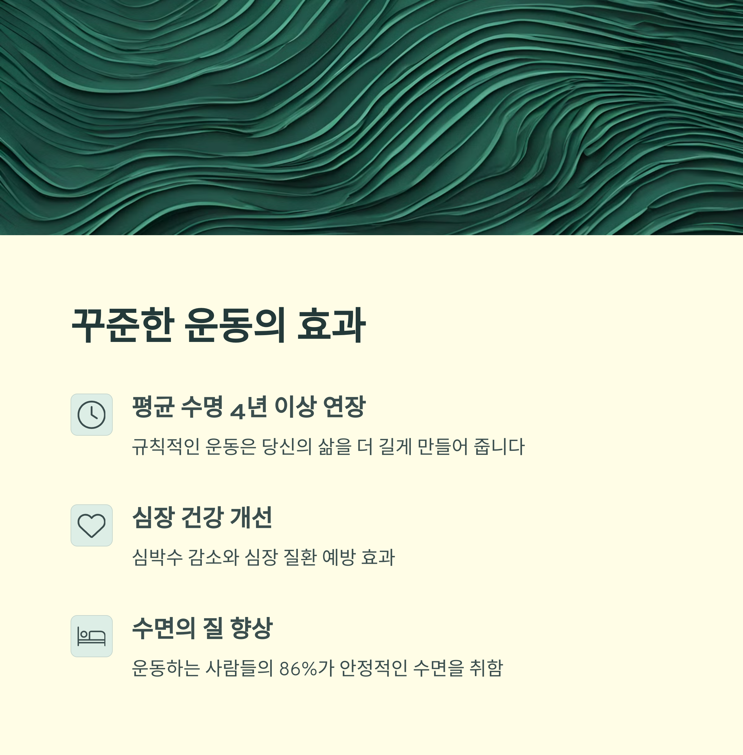 | 운동하는 사람은 평균 4년 더 오래 삽니다. | 하루 160분 걷기로 기대수명 최대 11년 연장 | 가벼운 운동부터 꾸준한 루틴화가 중요 |