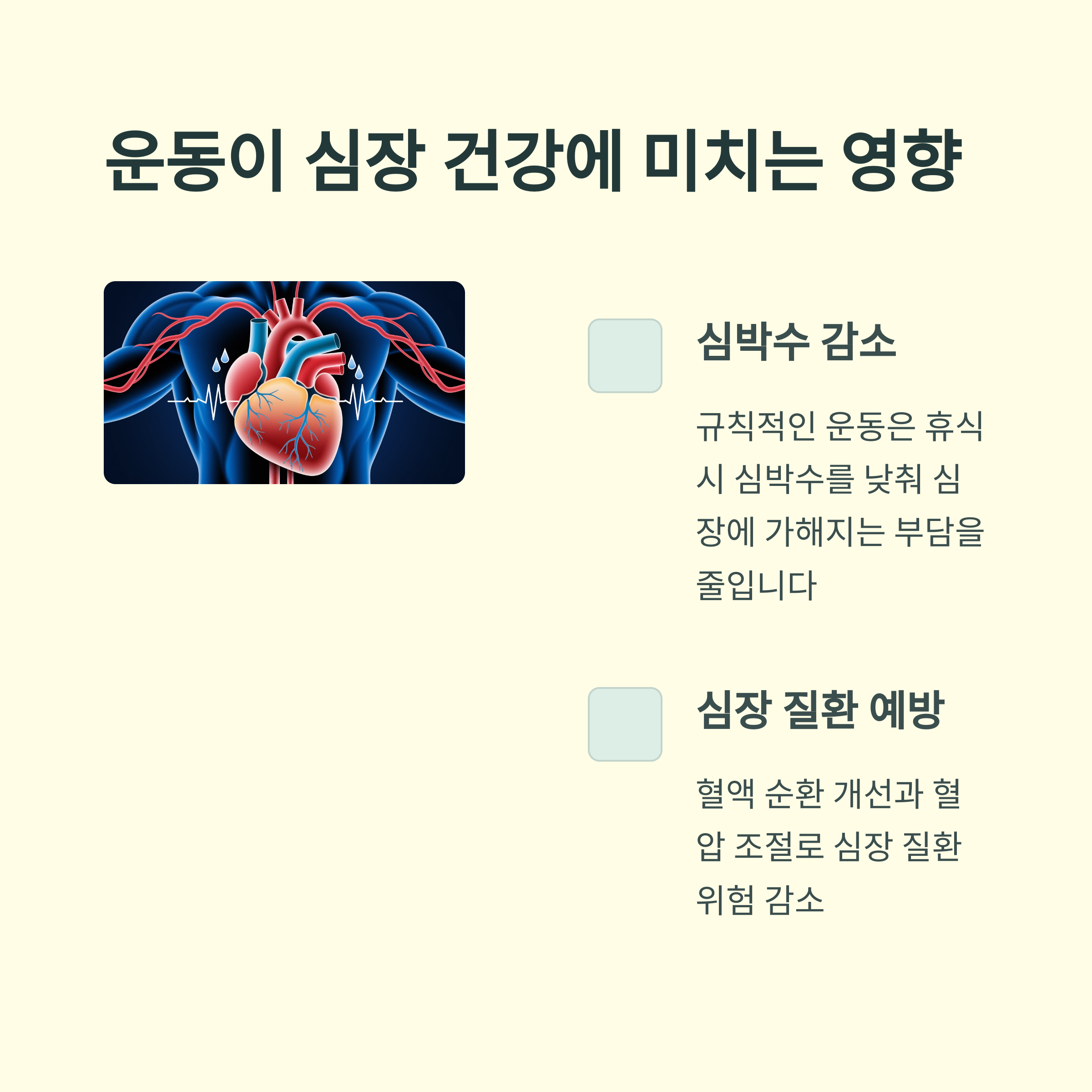 | 심장 건강 개선 및 만성질환 위험 감소 | 체중 감량과 면역력 향상에도 효과적 | 무리한 운동보다 지속 가능성이 중요 |