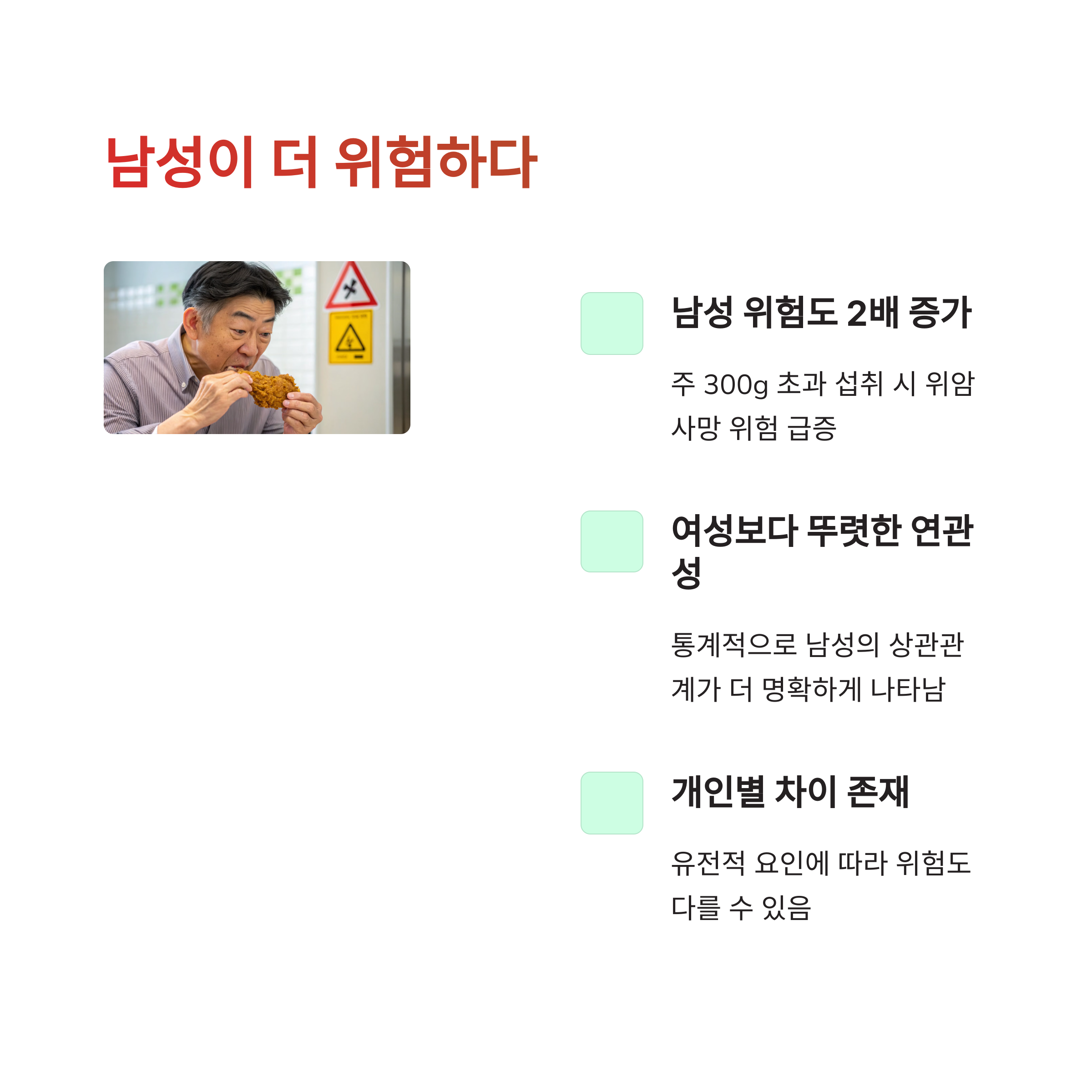 남성은 위장암 사망 위험이 100g 이하 섭취자 대비 2.6배까지 치솟았어요.
