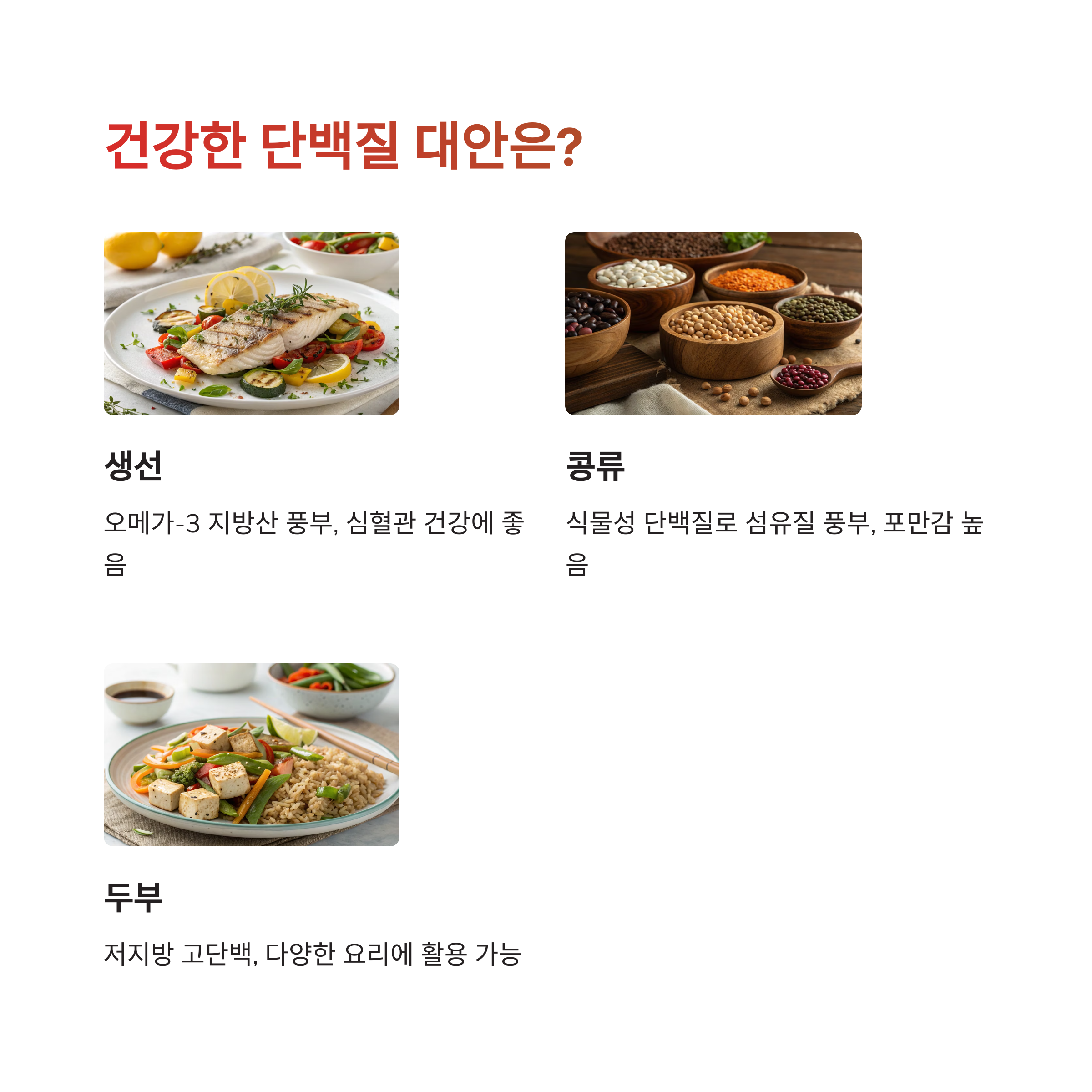 ✅ 콩류 및 식물성 단백질 - 두부, 병아리콩, 렌틸콩 등은 콜레스테롤 걱정 없이 훌륭한 단백질원이 됩니다.