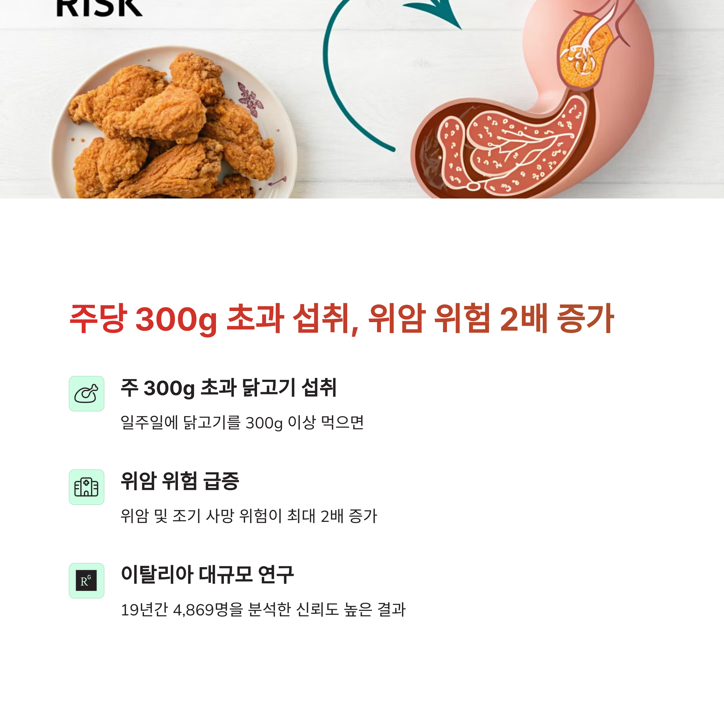 그 결과, 주당 300g 이상 닭고기를 섭취하는 사람은 100g 이하 섭취자 대비 위장암으로 인한 사망 위험이 2배 이상 높았다고 합니다.