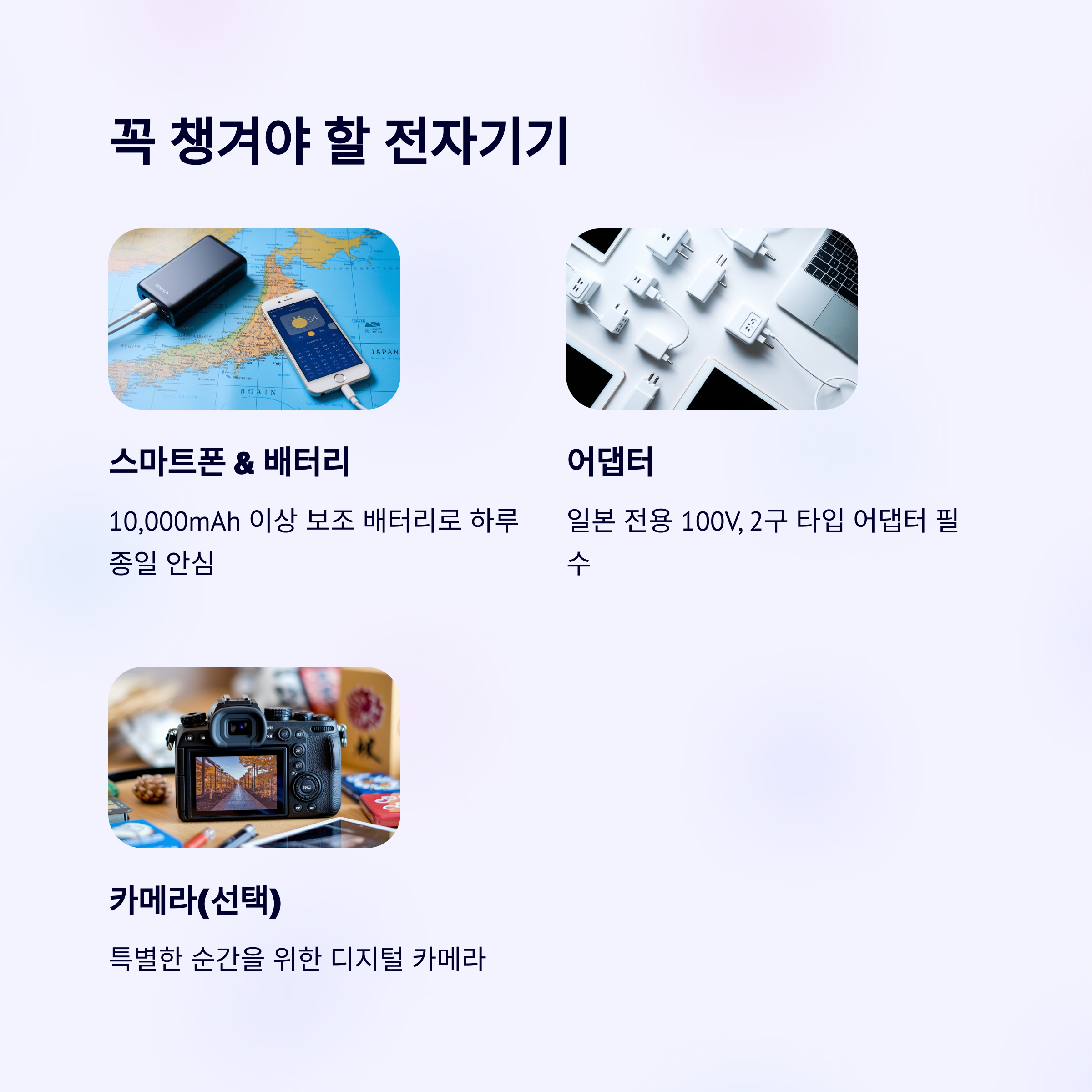 일본 전용 어댑터도 잊지 마세요! 여권/항공권 정보 미리 입력 권장 가볍고 실용적인 짐 꾸리기 팁 포함