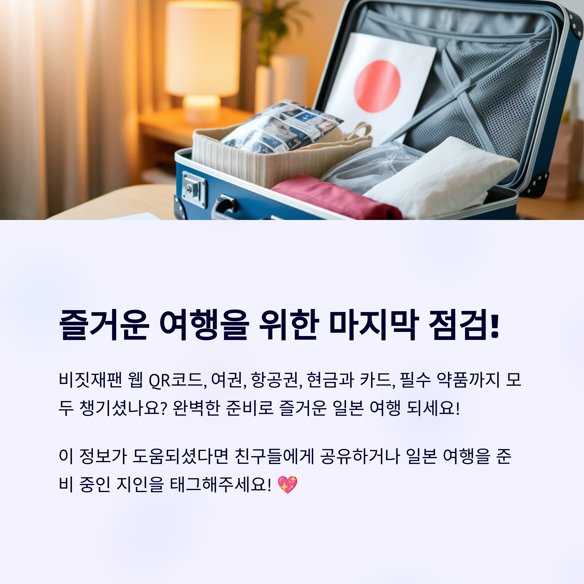 준비가 완벽하면 여행은 훨씬 더 즐겁습니다. 사소해 보이지만 빠뜨리기 쉬운 준비물을 체크하고, 입국 시 시간을 절약해주는 비짓재팬 등록까지 마무리하면 여행의 시작부터 기분 좋게 출발할 수 있겠죠. 미리미리 준비하면 걱정도 줄고 여유는 커집니다. 여행 가방을 싸기 전, 이 리스트를 다시 한번 확인해보세요!