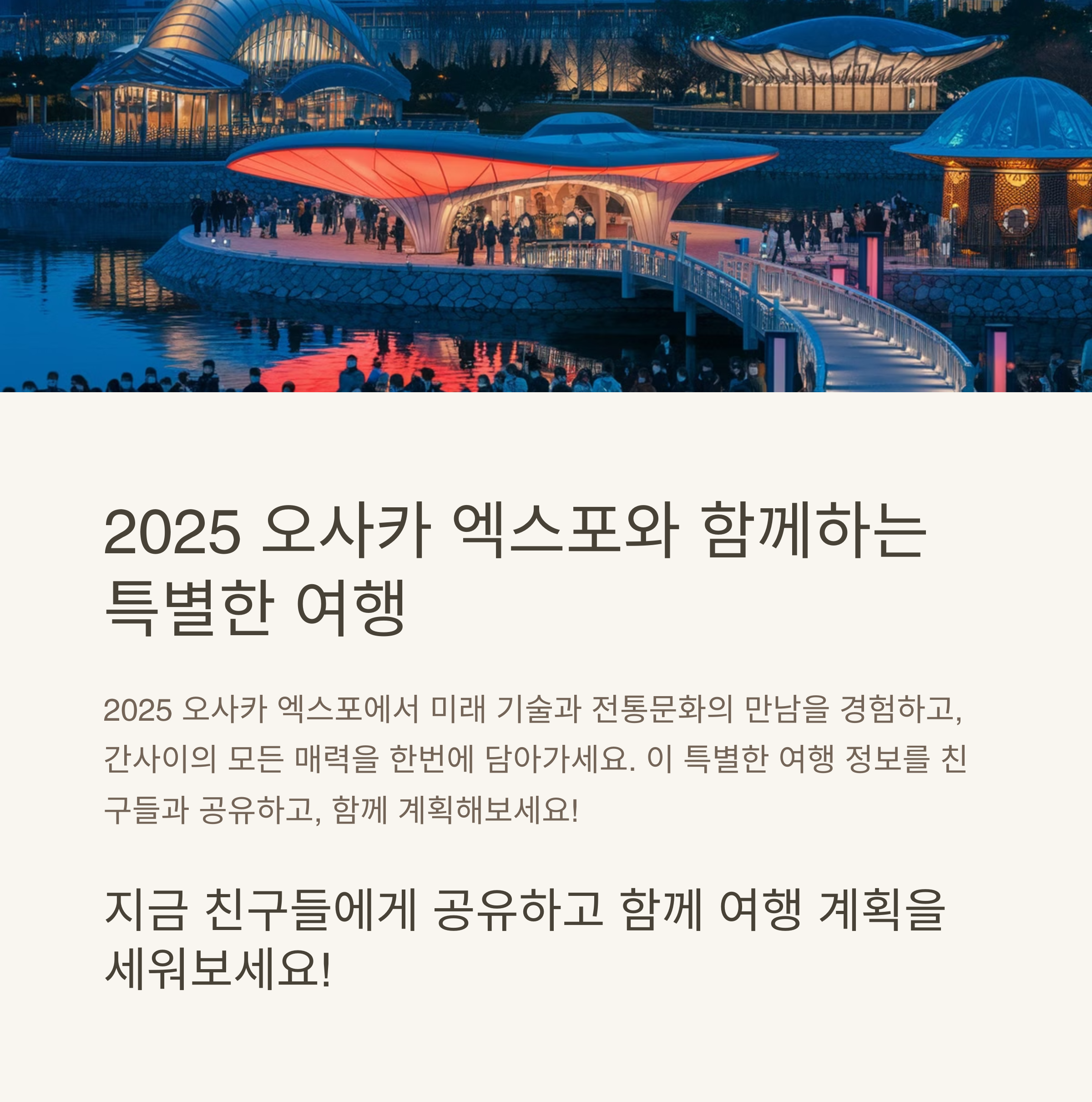 | 쇼핑과 야경 모두 만족 | 전통과 자연 조화로운 여행지 | 2025 엑스포와 연계한 스마트한 일정 |