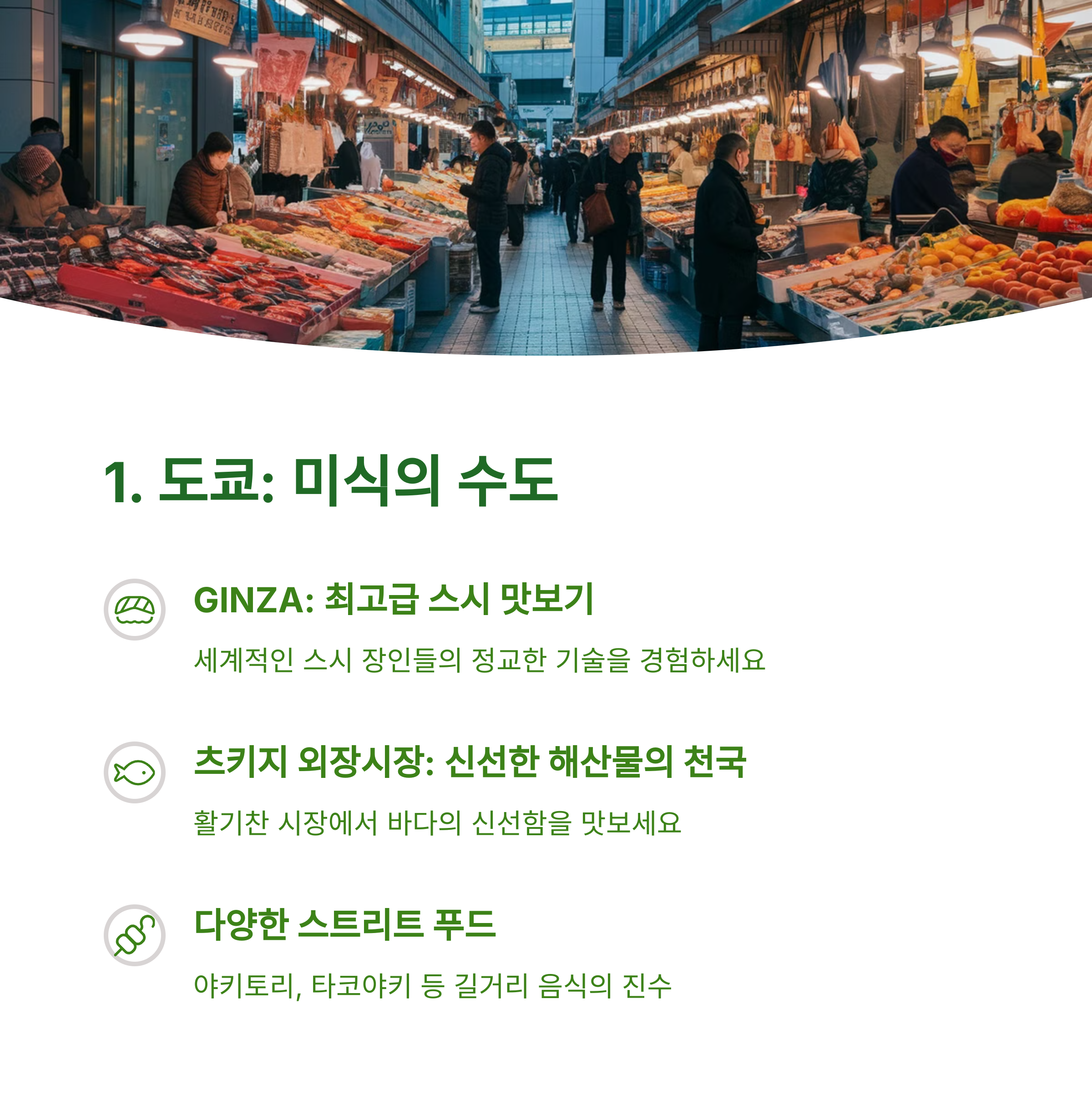 | 도쿄 | GINZA에서 신선한 스시를 즐기고, 츠키지 외장시장에서는 신선한 해산물을 맛볼 수 있습니다. |