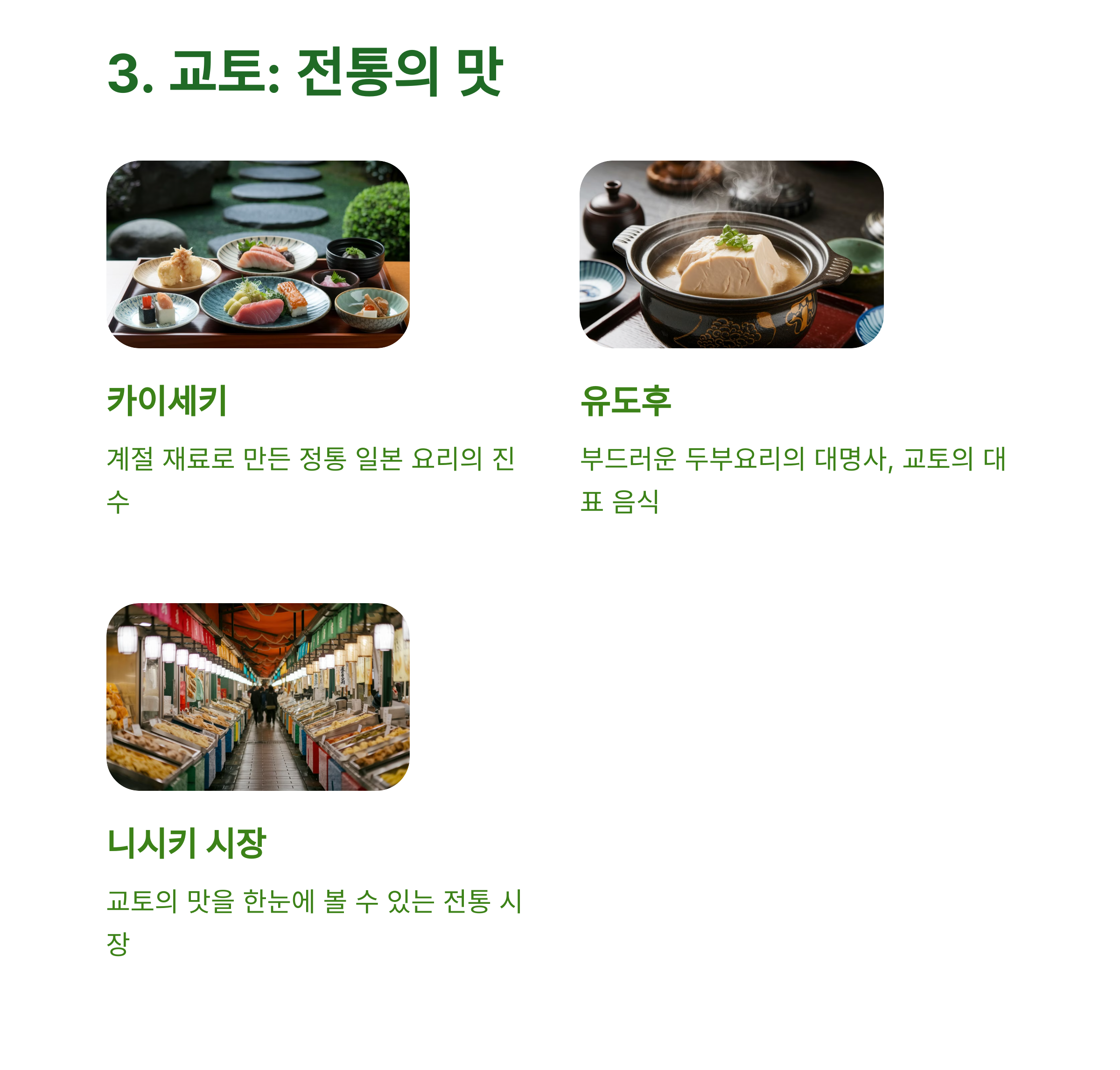 교토는 일본 전통의 미식 문화를 그대로 느낄 수 있는 도시입니다. 특히 카이세키는 교토에서 꼭 경험해야 할 요리로, 정통 일본 요리의 정수를 보여줍니다. 또한 유도후와 마차 디저트는 교토만의 독특한 맛을 자랑하는 인기 메뉴입니다. 니시키 시장에서는 다양한 지역 특산품을 구매할 수 있으며, 현지에서만 맛볼 수 있는 신선한 재료를 사용한 요리를 즐길 수 있습니다.