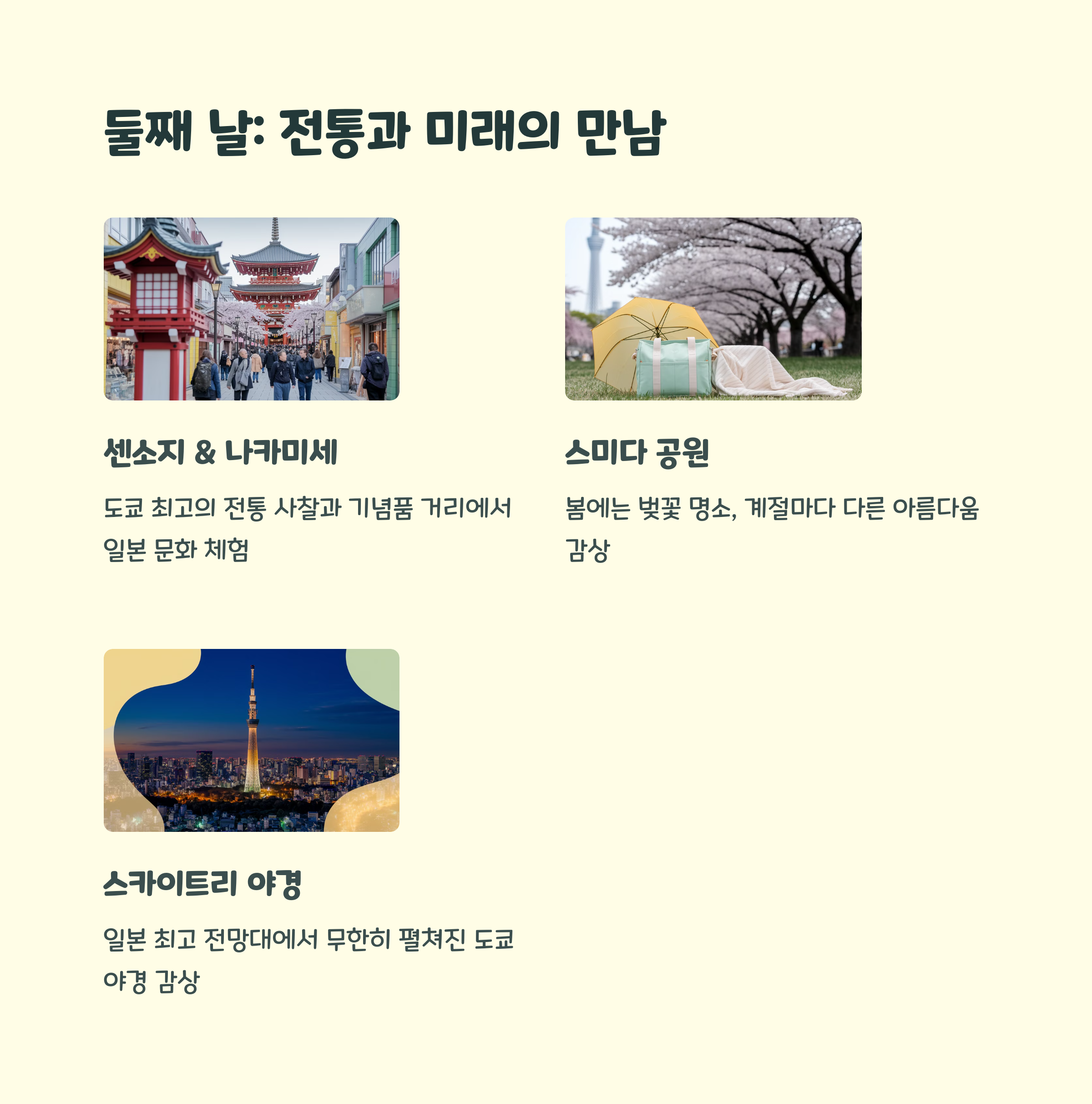 첫째 날은 도쿄 도착 후 짐을 숙소에 맡긴 뒤,   활기찬 분위기의 시부야와 하라주쿠를 중심으로 쇼핑과 스트리트 문화를 경험하고, 메이지 신궁에서의 힐링까지 더해지는 일정입니다. 둘째 날은 아사쿠사에서 센소지 절과 나카미세 거리를 즐기며 일본의 전통적인 분위기를 체험합니다. 이후 스미다강 주변 산책, 도쿄 스카이트리 야경까지 연결하면 조용하지만 감성적인 도쿄를 만나게 됩니다. 마지막 날은 아침 시간대에 신주쿠 고든거리나 도쿄역 주변을 산책하며 마무리합니다. 호텔 체크아웃 전까지 여유로운 일정으로 이동 부담 없이 도쿄의 분위기를 마저 느낄 수 있습니다.