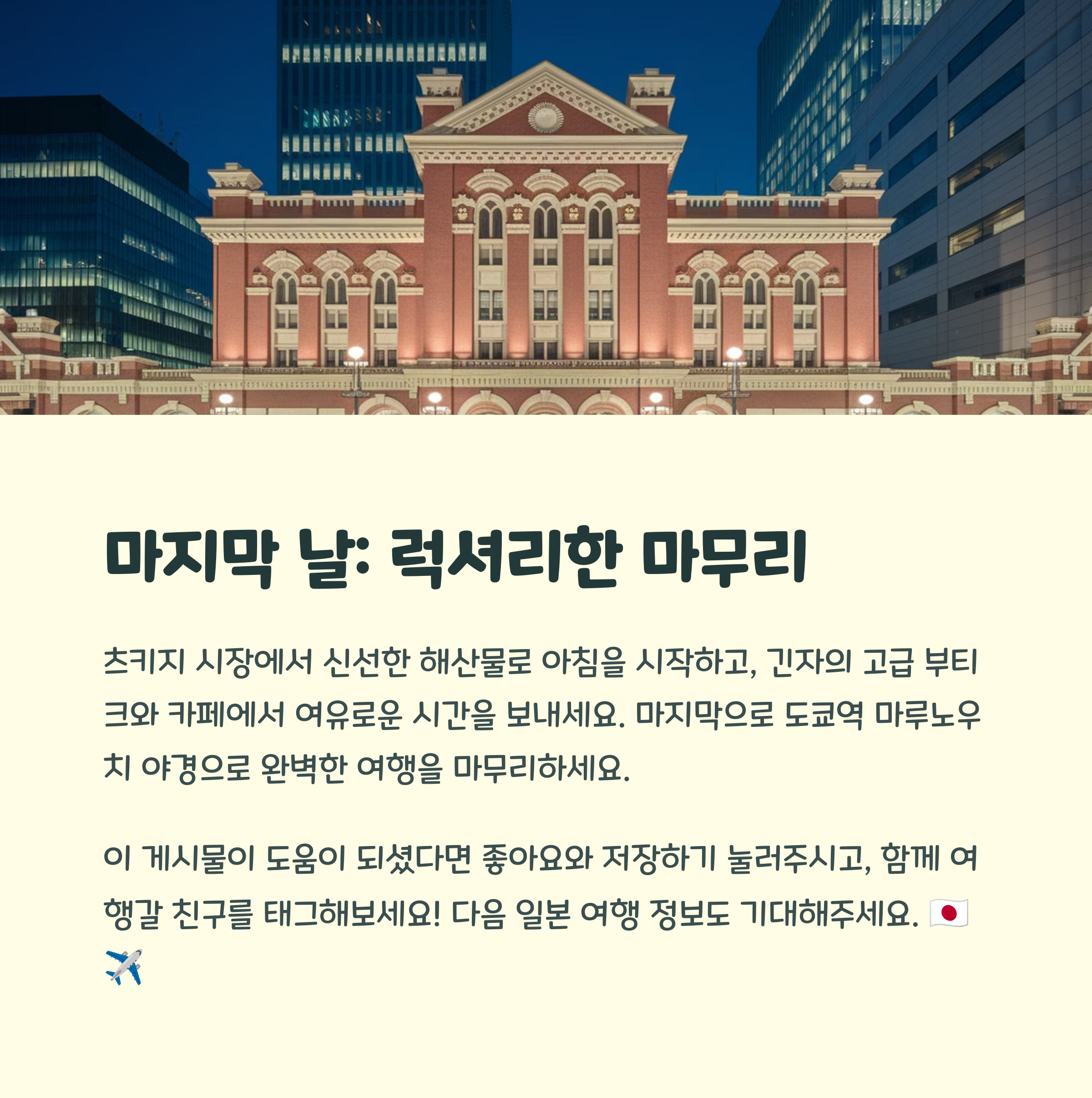 도쿄 자유여행은 철저한 계획과 약간의 팁만 있다면 초보자도 부담 없이 다녀올 수 있는 매력적인 여행입니다. 복잡할 것 같던 지하철도 실제로 이용해보면 생각보다 간단하며, 도보 이동도 적절히 섞으면 여행의 피로도를 줄일 수 있습니다. 이번 2박 3일 코스를 따라가다 보면, 어느 순간 도쿄가 낯선 도시가 아니라 편안한 추억의 장소가 될 것입니다. 지금 바로 여행을 떠날 준비를 해보세요. 여러분만의 도쿄가 기다리고 있습니다.