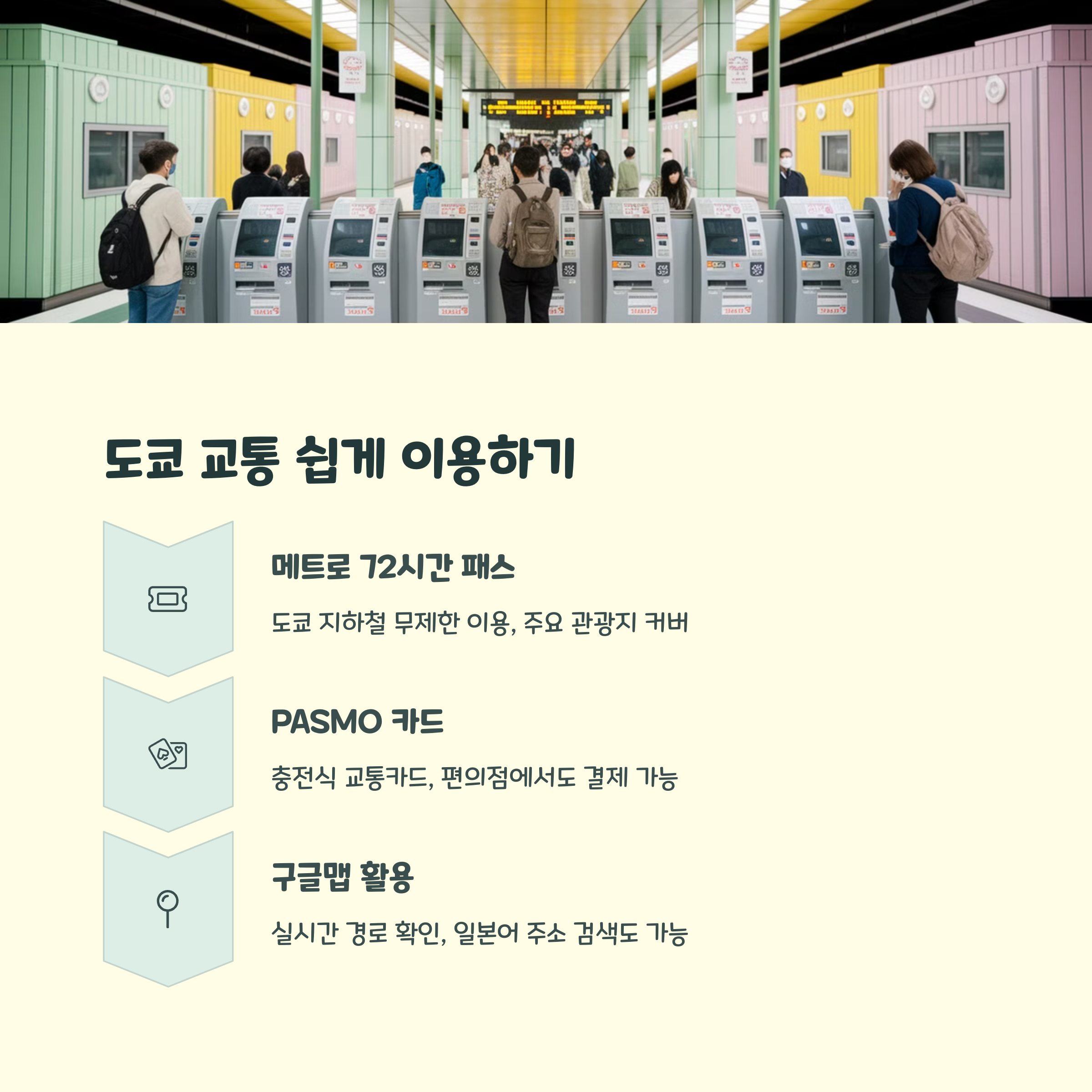 도쿄 자유여행에서는 교통패스를 적극 활용하는 것이 중요합니다. 특히 지하철 중심의 이동을 계획할 경우, 도쿄 메트로 패스를 활용하면 경제적으로도 효율적입니다. 또한 숙소는 시부야, 신주쿠 등 중심부에 위치한 곳을 선택하면 여행 내내 불필요한 이동 시간을 줄일 수 있어 만족도가 높습니다. 일본어를 몰라도 영어 표기와 친절한 안내 시스템 덕분에 크게 어렵지 않게 여행이 가능합니다. 단, 일정을 짤 때는 너무 빡빡하게 계획하기보다는 유연한 시간을 두고 예상치 못한 발견을 즐기는 여유를 가지는 것이 좋습니다.