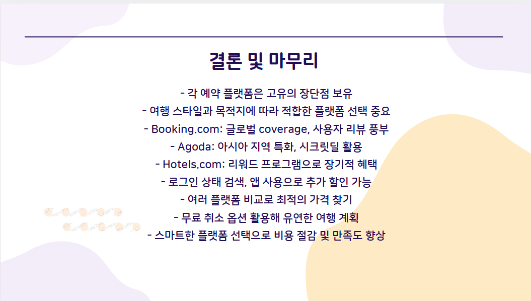 지금까지 다양한 할인 숙소 예약 사이트와 그 장단점을 살펴봤습니다. 각 사이트는 보유 숙소, 할인 정책, 지역 특화 요소가 다르기 때문에 단 하나를 고집하기보다는, 상황에 맞는 도구를 선택하는 것이 현명한 접근입니다. 플랫폼별 기능과 혜택을 잘 이해하고 활용하면 훨씬 적은 비용으로 더 좋은 숙박 경험을 누릴 수 있습니다. 여행의 질은 잠자리에서부터 달라진다는 말, 이제는 실감 나시죠?