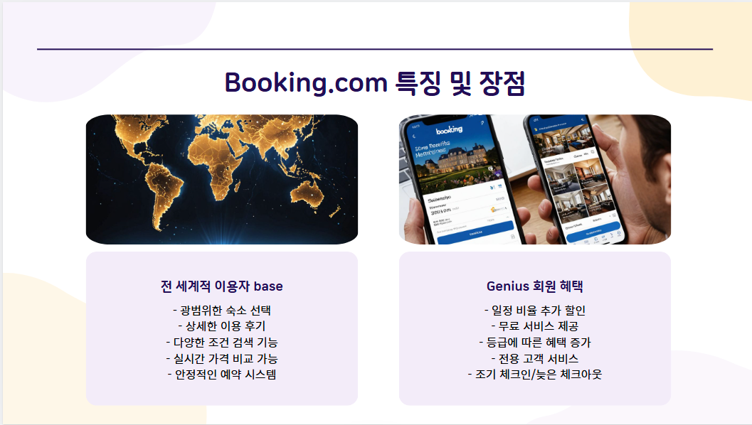 여행 경비를 절감하고 싶은 분들이라면, 다양한 숙박 예약 플랫폼을 비교하는 것이 유리합니다. Booking.com은 전 세계 이용자가 많은 만큼, 이용 후기와 조건 검색 기능이 잘 갖춰져 있어 편리함과 안정성을 동시에 갖춘 선택지입니다. 특히 Genius 회원에게는 일정 비율의 추가 할인이나 무료 서비스 혜택이 제공되어 만족도 높은 예약 경험을 제공합니다.
