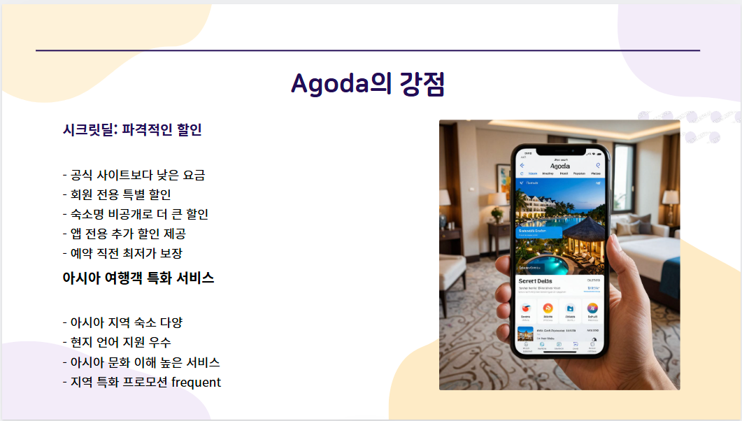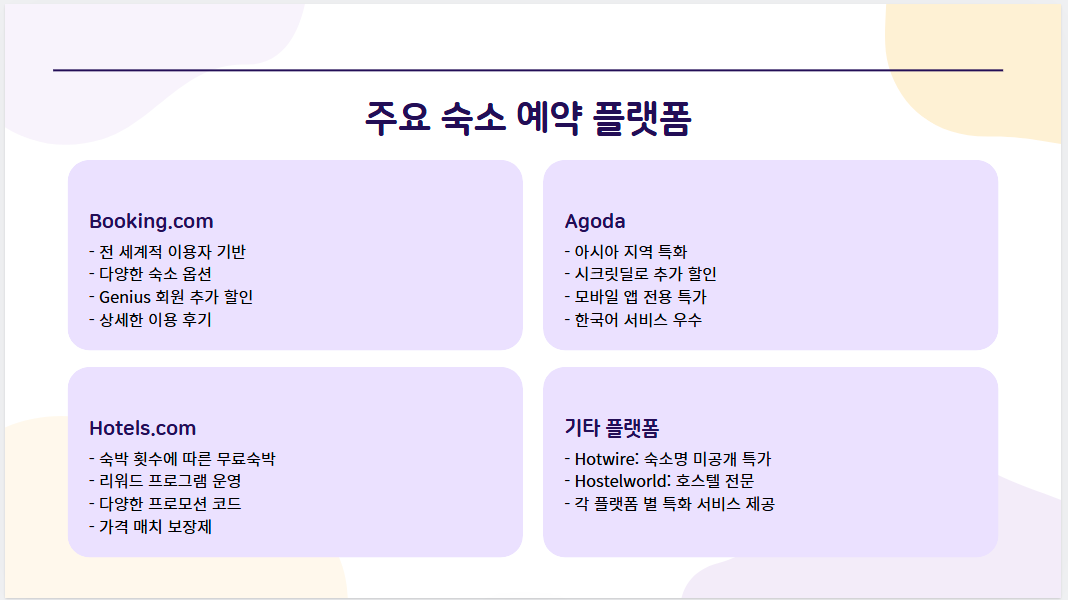 | 주요 플랫폼 | Booking, Agoda, Hotels.com, Hotwire, Hostelworld 등 |