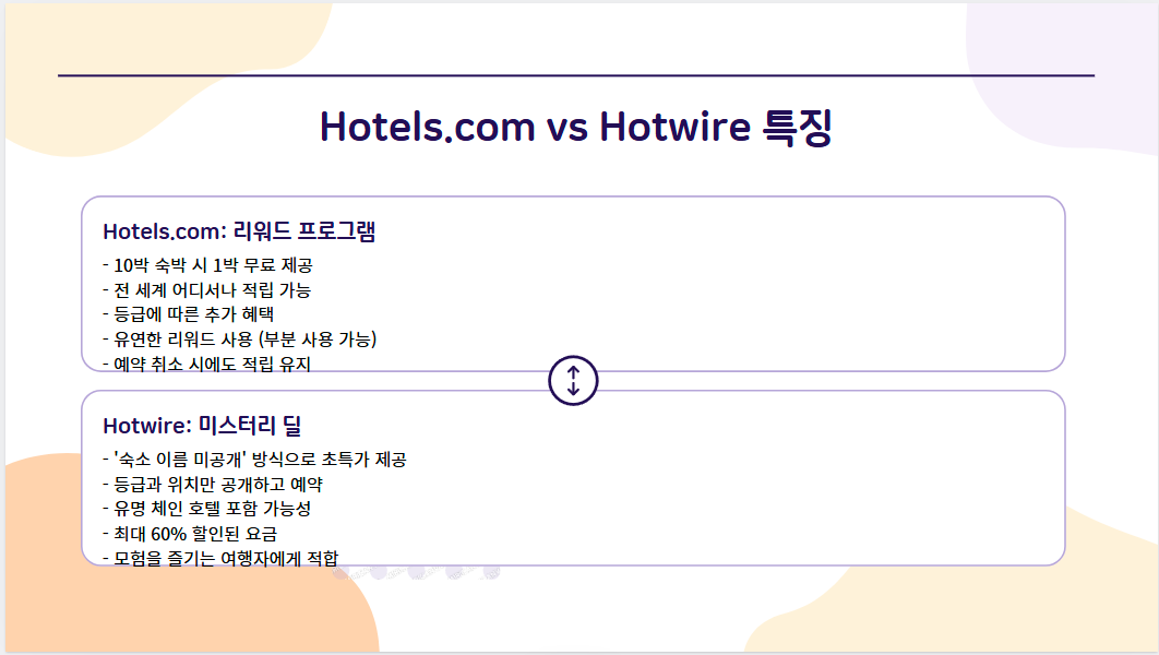 Booking은 전 세계 커버리지와 사용자 리뷰가 강점이고, Agoda는 아시아권에 특화된 가격 경쟁력이 있습니다. Hotwire는 브랜드 호텔을 이름 없이 저렴하게 제공하며, Hotels.com은 숙박 리워드 프로그램이 매력적이죠.