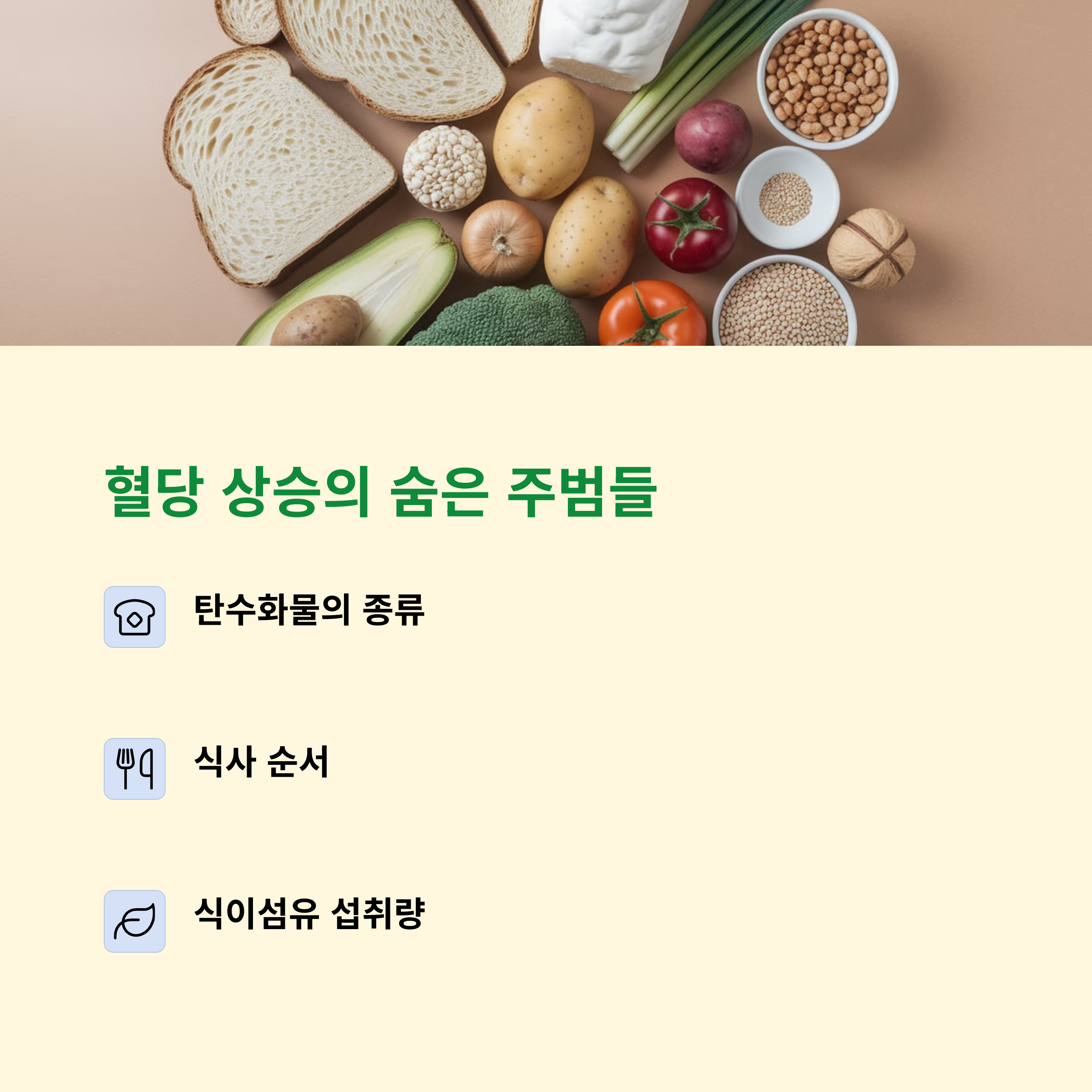 | 식사 순서 | 채소→단백질→탄수화물 순으로 먹으면 혈당 변화가 완만해집니다 |