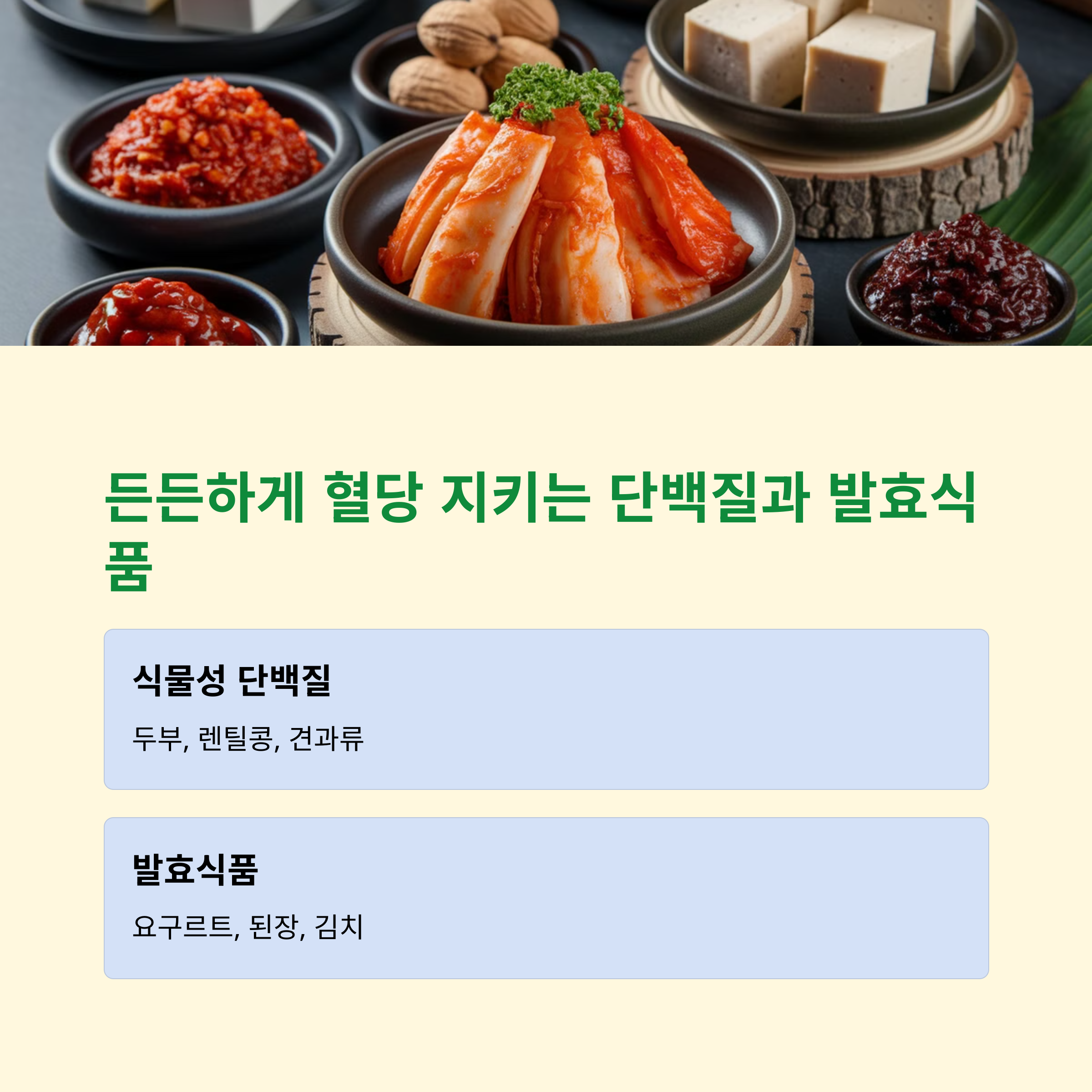 귀리, 병아리콩, 고구마, 브로콜리, 두부 등 | 채소 → 단백질 → 탄수화물 순으로 섭취 | 김치, 된장, 요거트, 낫토 등 프로바이오틱스 함유 |