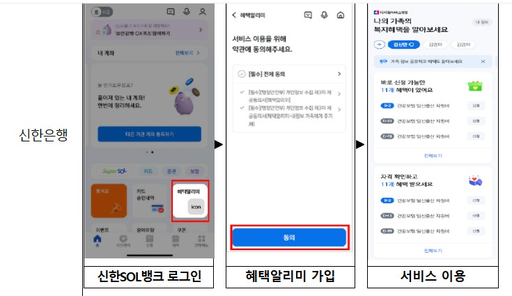 A. ‘혜택알리미’는 단독 앱이 아니라, 현재는 기업은행(i-ONE Bank), 신한은행(SOL) 앱 내에서 제공됩니다. 플레이스토어나 앱스토어에서 해당 앱을 먼저 설치해 주세요.