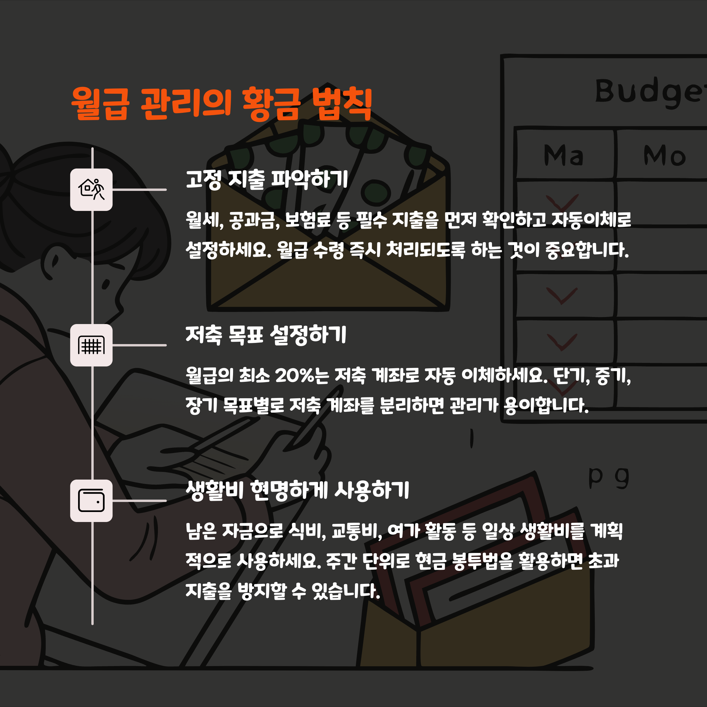 | 수입과 지출을 정리하는 습관을 말합니다. | 월급을 체계적으로 관리하는 방식입니다. | 불필요한 소비를 줄이고 계획적으로 사용하는 습관입니다. |