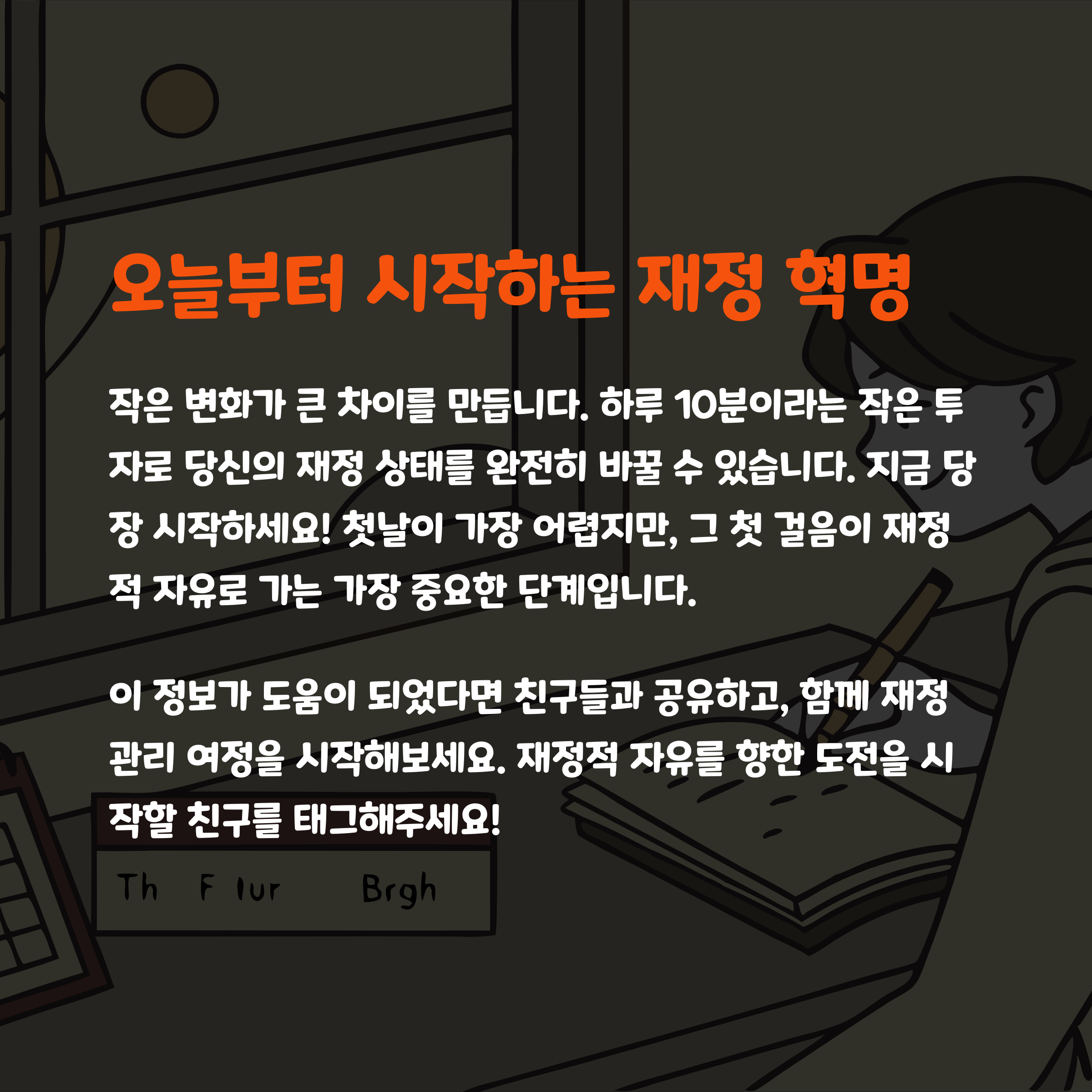 하루 10분의 습관이 가져다주는 변화는 생각보다 큽니다. 재무 다이어리는 자신의 재정 상태를 명확히 파악하고, 소비 습관을 개선하며, 장기적인 목표 달성을 돕는 강력한 도구입니다. 수입과 지출을 기록하는 것은 단순한 통계가 아닌, 자신을 돌아보는 시간이기도 합니다. 월급 루틴이 바뀌면 삶의 여유와 목표의식 또한 함께 바뀌게 됩니다. 꾸준한 기록으로 돈에 대한 자신감을 갖고, 더 나은 미래를 계획해 보세요.