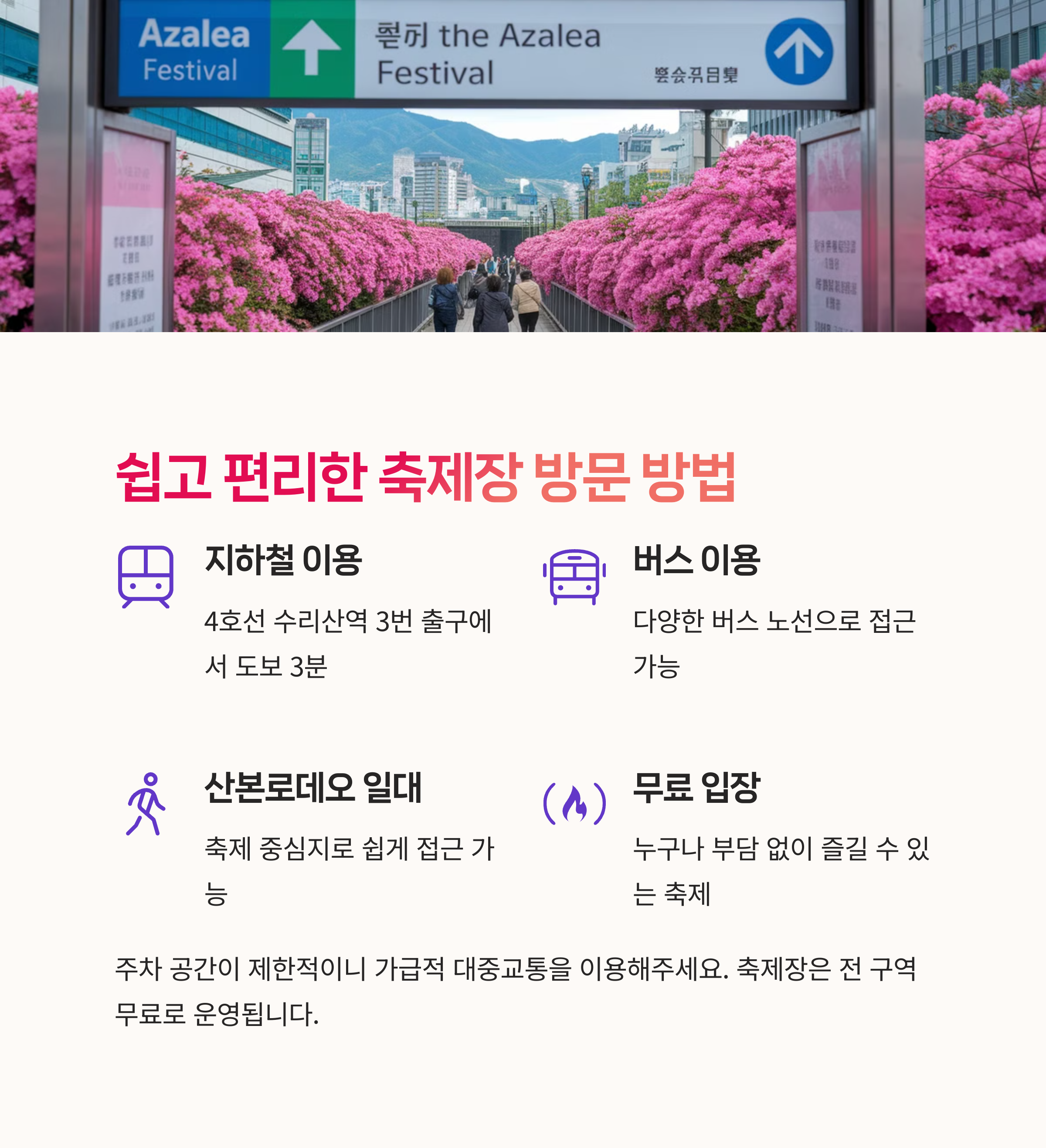 군포 철쭉 축제장으로 가는 길, 생각보다 편리해요. 특히 지하철 4호선 수리산역 3번 출구에서 나와 3분만 걸으면 철쭉동산에 도착할 수 있답니다. 사당역이나 강남역에서 출발해도 환승 없이 쭉쭉! 게다가 축제 기간에는 주요 행사 구간이 ‘차없는거리’로 운영돼서 도보 이동이 훨씬 쾌적하죠.