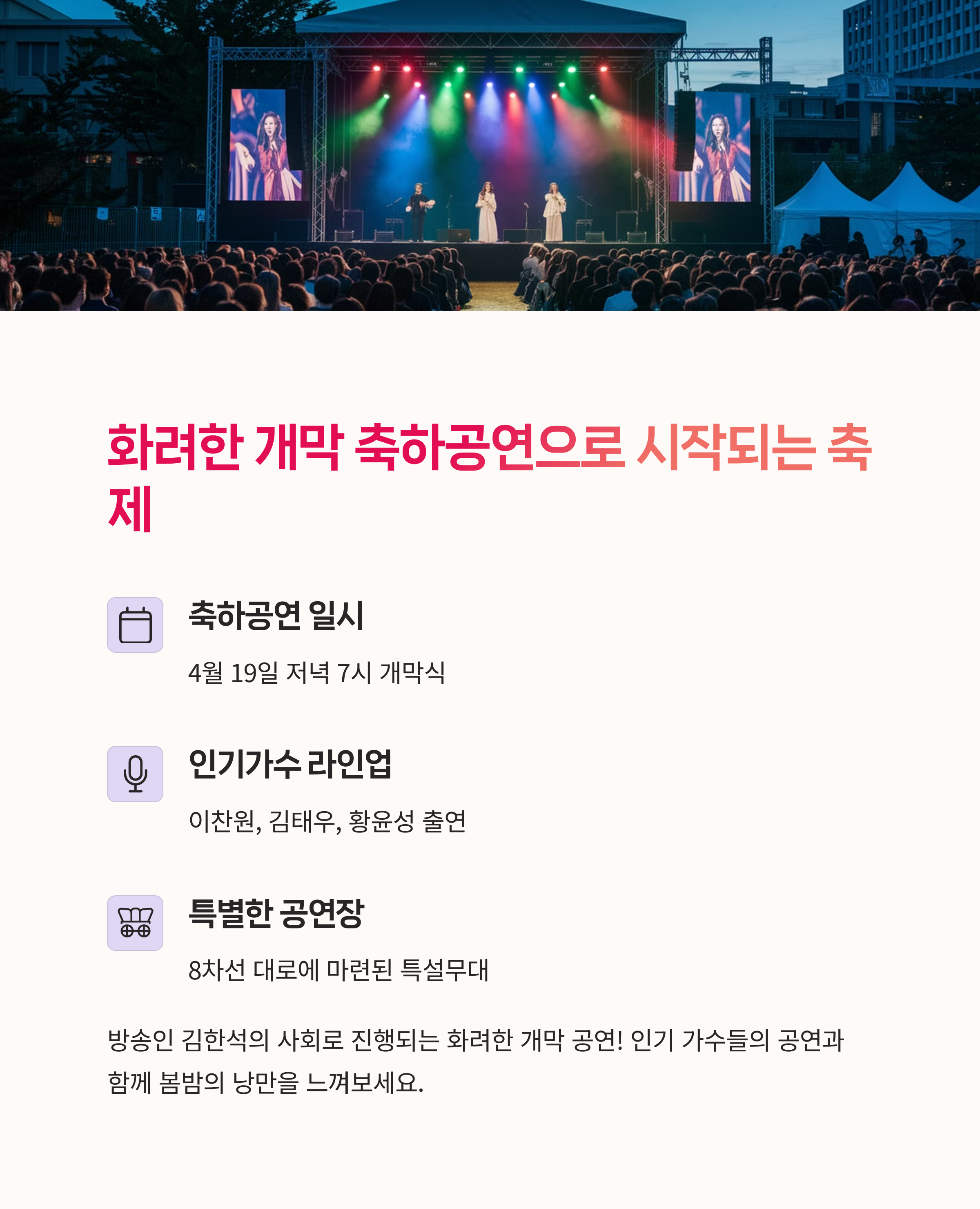 | 4/19(토) | 개막식 & 공연 (이찬원, 김태우, 황윤성) | 차없는거리 특설무대 |