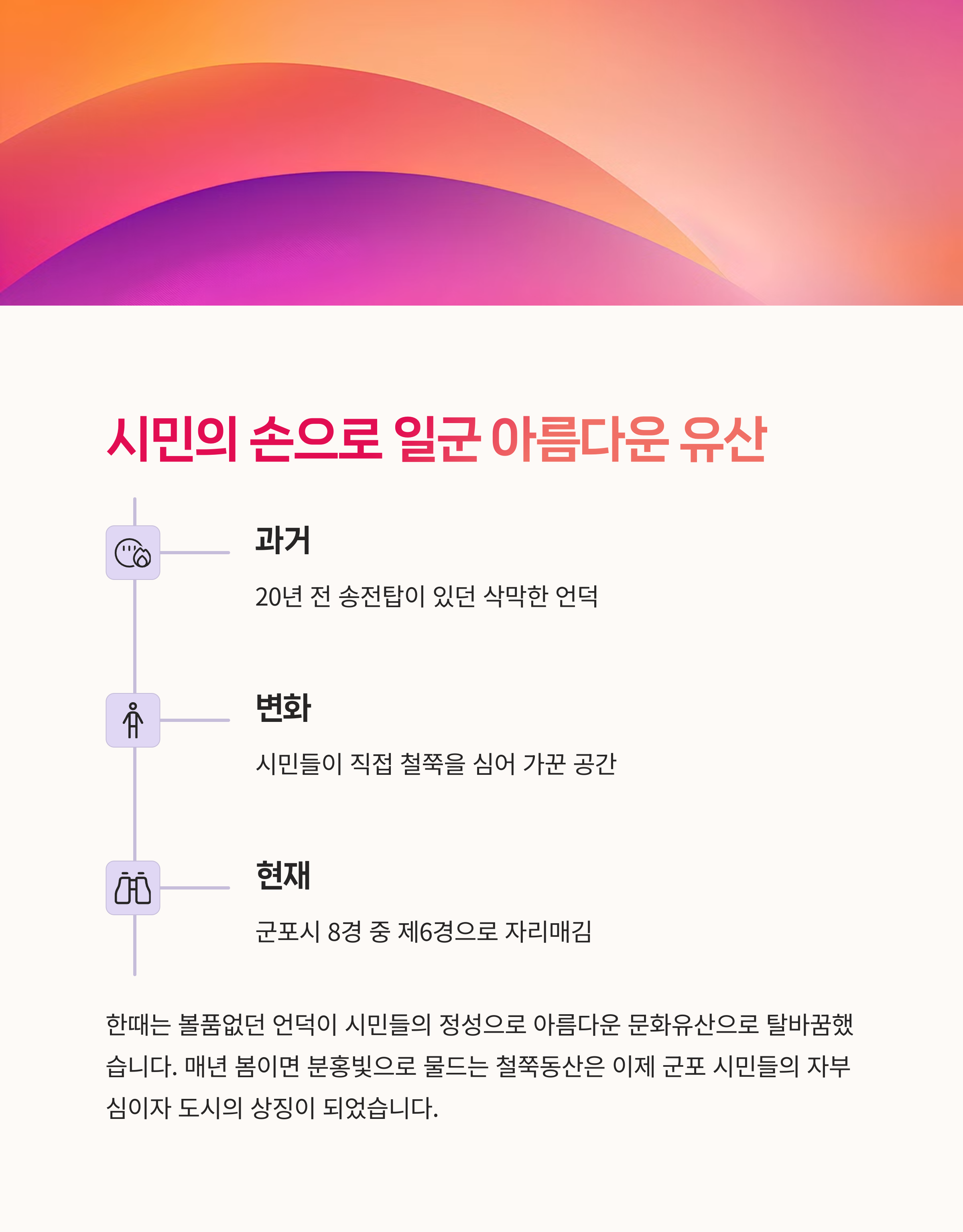 군포 철쭉 축제는 단순한 봄꽃 구경이 아니에요. 이 축제의 뿌리는 무려 20년 전, 시민들과 공무원들이 힘을 모아 황량한 송전탑 언덕에 철쭉 묘목을 심으면서 시작됐어요. 그렇게 탄생한 철쭉동산은 지금은 22만 그루 이상의 철쭉이 피어나는 장관의 명소가 되었고요.