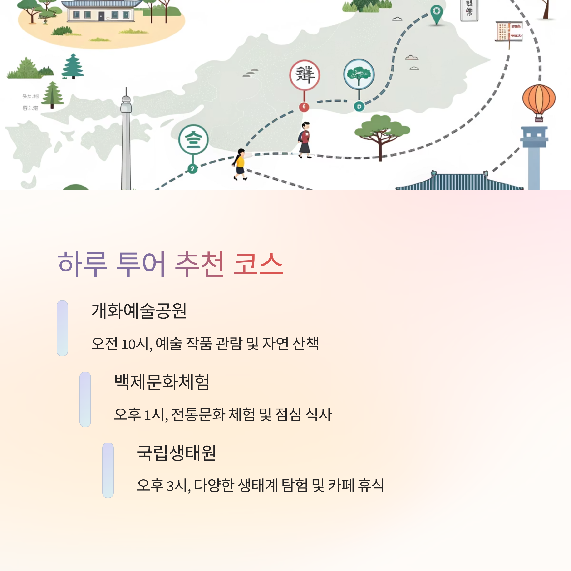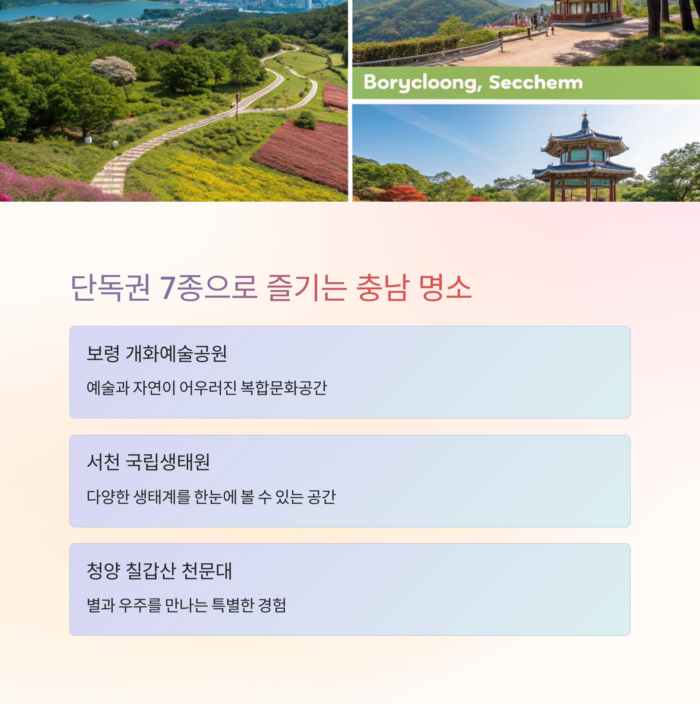 - “보령 개화예술공원 → 청양 박물관 → 서천 국립생태원” 같은 연계 코스 추천!