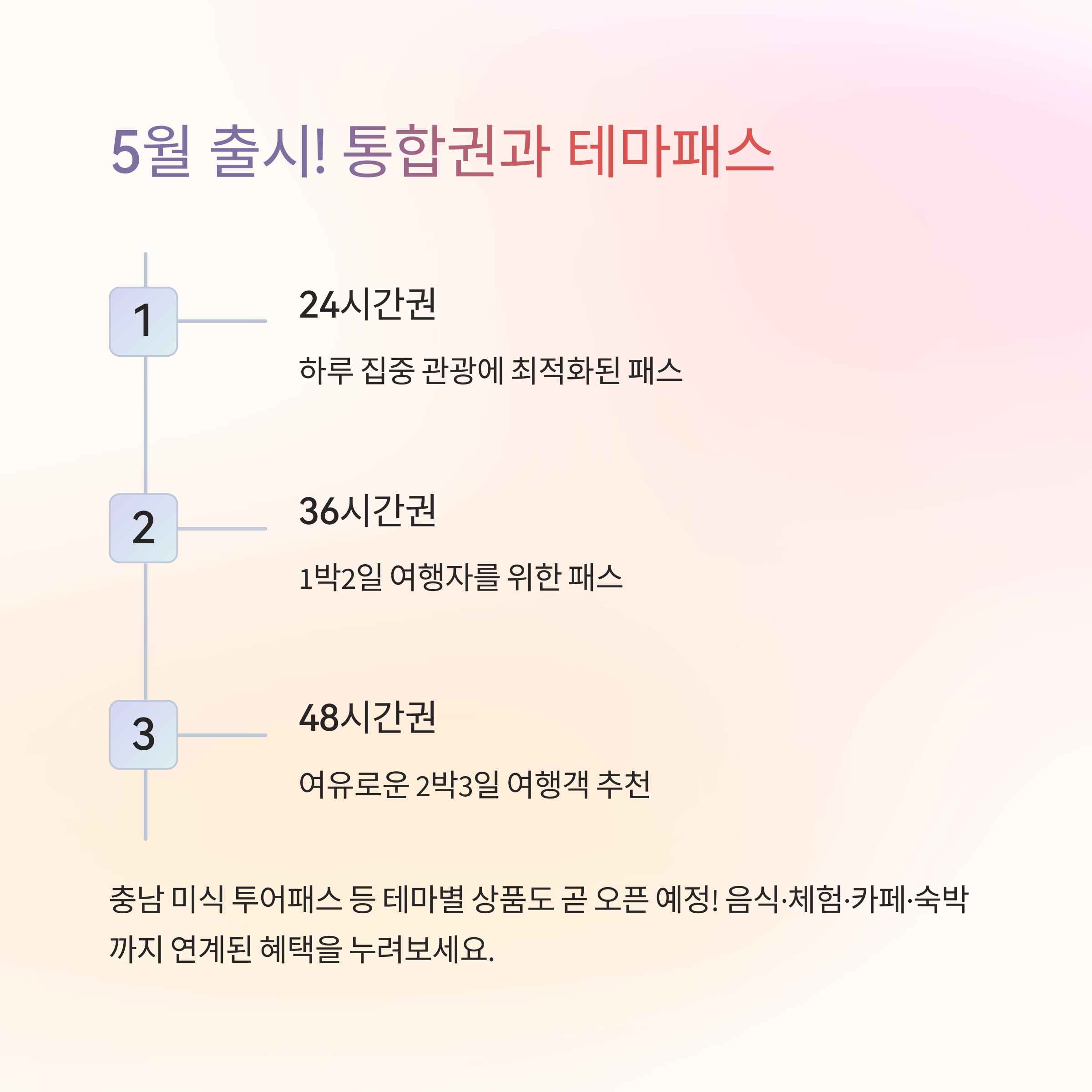 충남도는 5월부터 ‘시간제 통합권’과 ‘미식 투어패스’도 출시 예정이에요! 예를 들어 24시간권, 36시간권, 48시간권처럼 시간에 따라 자유롭게 관광지를 넘나들 수 있는 티켓이 생기고,